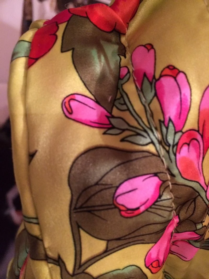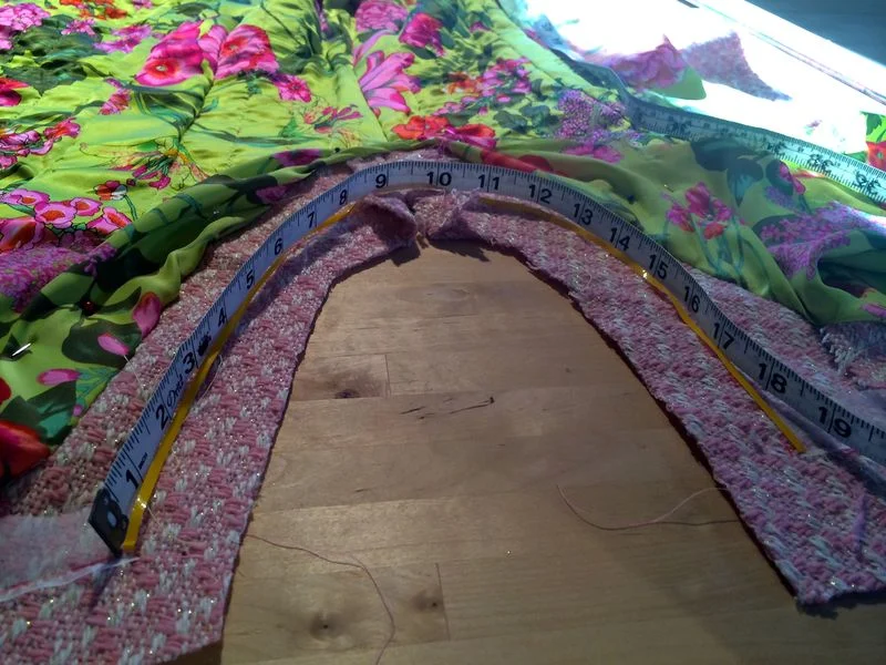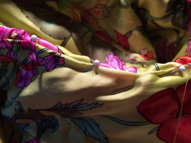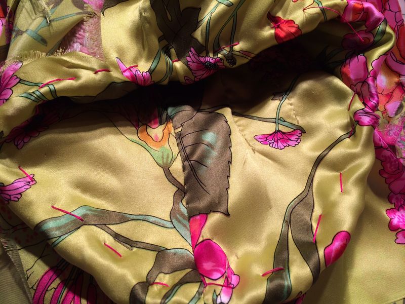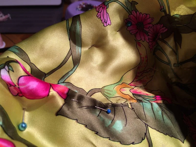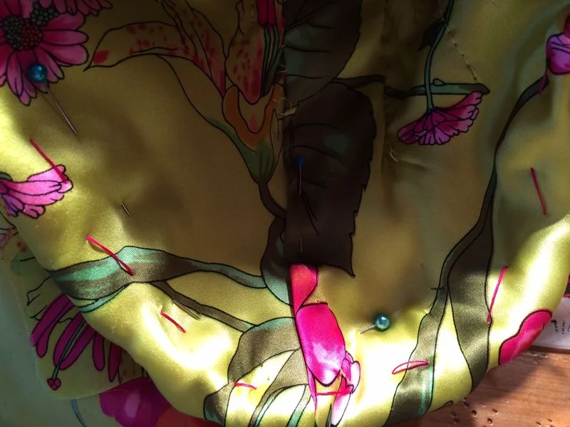 Once you have your fabric all pinned along the internal sleeve seam and you are happy that the fabric and lining is not being pulled or stretched (you will see lumps and puckers from the outside) cut the silk down to about 1/2" or less, leaving the pins in place...working above them towards the sleeve.