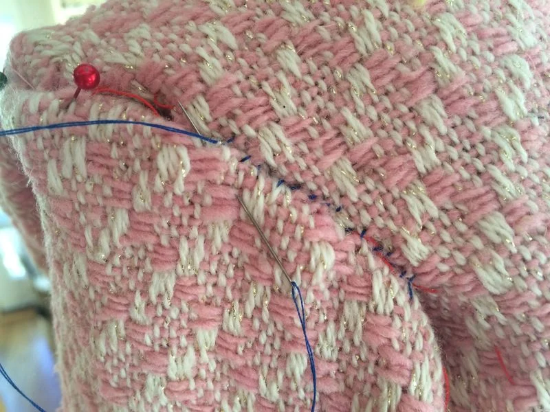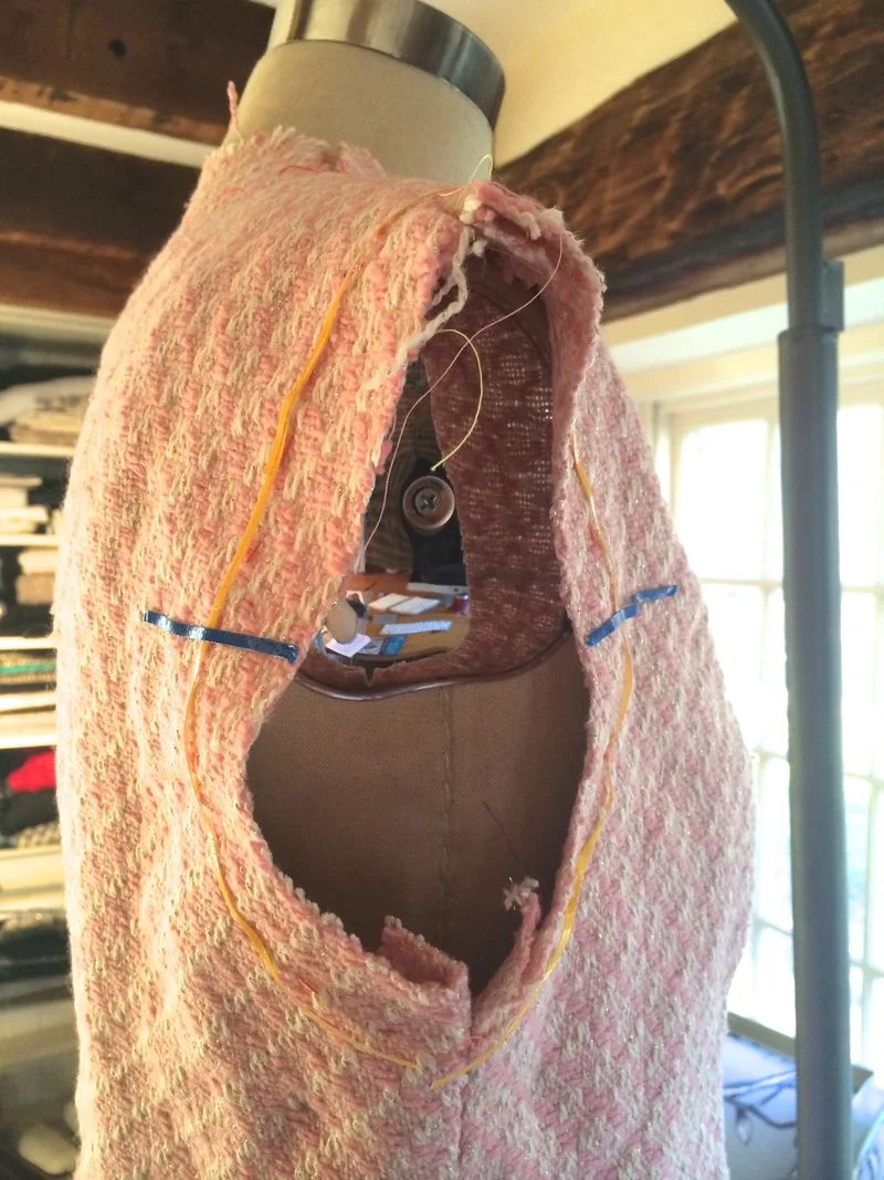 I should also mention grainlines again here. Hopefully your basting grainlines are still on your sleeves, and you can see that the cross grain is still parallel to the floor. A twisting sleeve will effect fit and the hang of the entire jacket. If you don't have a grainline on your sleeve, just lay your pattern piece over the top of a front piece and place some pins where the grain begins and ends, its worth the effort!