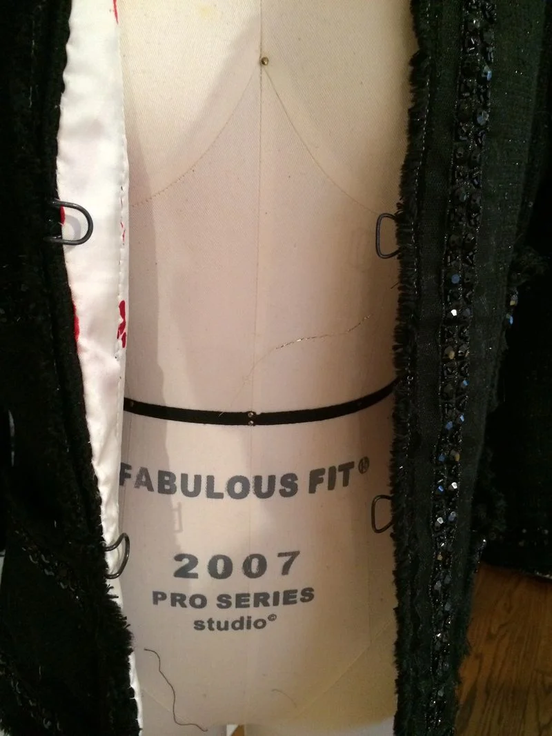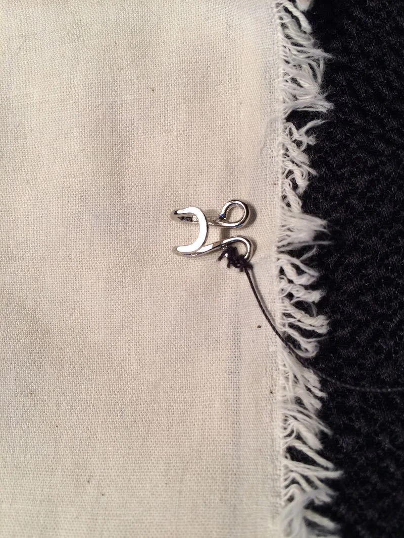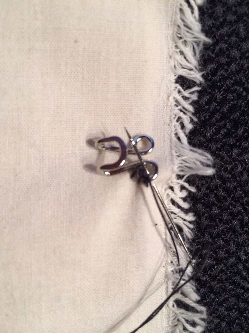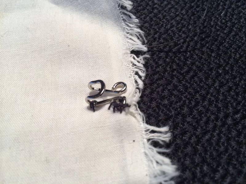 When your hooks and eyes are secure, trim and fold your lining around the front edge and neckline. Use a small fell stitch to close.