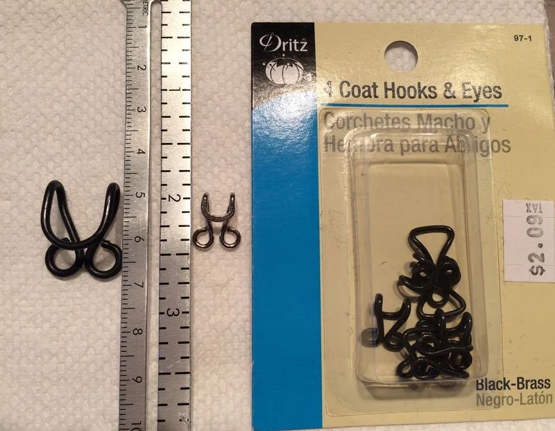 There are lots of different size hooks and eyes available in a variety of colours , so what you use is purely personal preference . On the first jacket I made, I used some smaller ones that were 3/8" wide and spaced them evenly apart, and on one of my recent LFJ 's I used 1/2" wide closures and made them a feature.