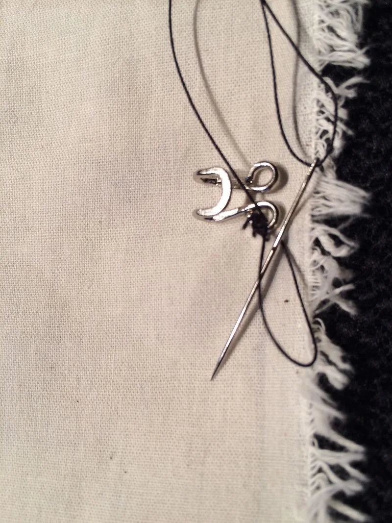 Continue until you have knots sewn evenly throughout both eyes. To finish, run a couple of stitches at the top end so that both ends are secure and tie it off.