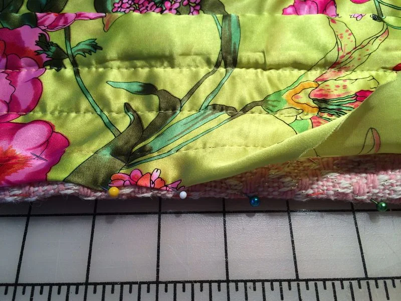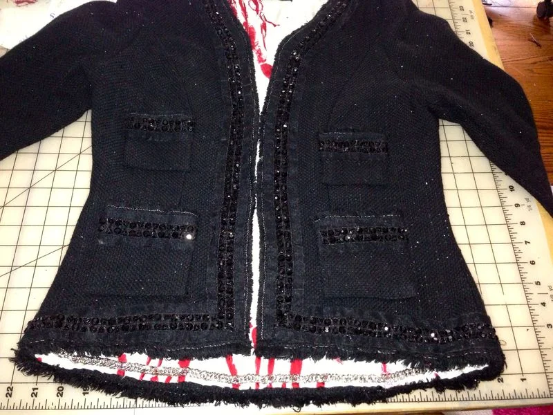 To sew, start your trim on the side seam of the hem where it is least noticeable and pin the whole jacket out before you begin. Check for flaws and marks before you sew!