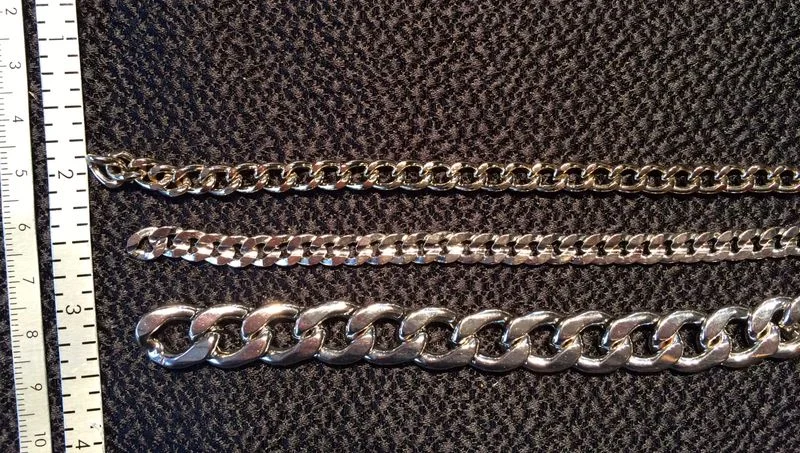 I am always trying out different sizes and shapes, and I think that a flat chain is far easier to sew and less obtrusive if you can find some and while it is more expensive it certainly looks nice...(middle and bottom chains)
