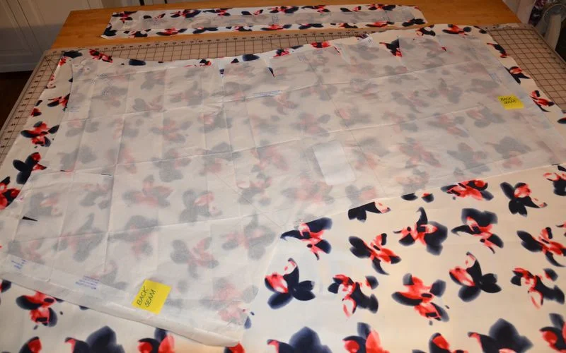 The two joining seams are marked above with yellow post it notes, one on the far left and the other on the upper right are the center back seam with the zipper position clearly marked.