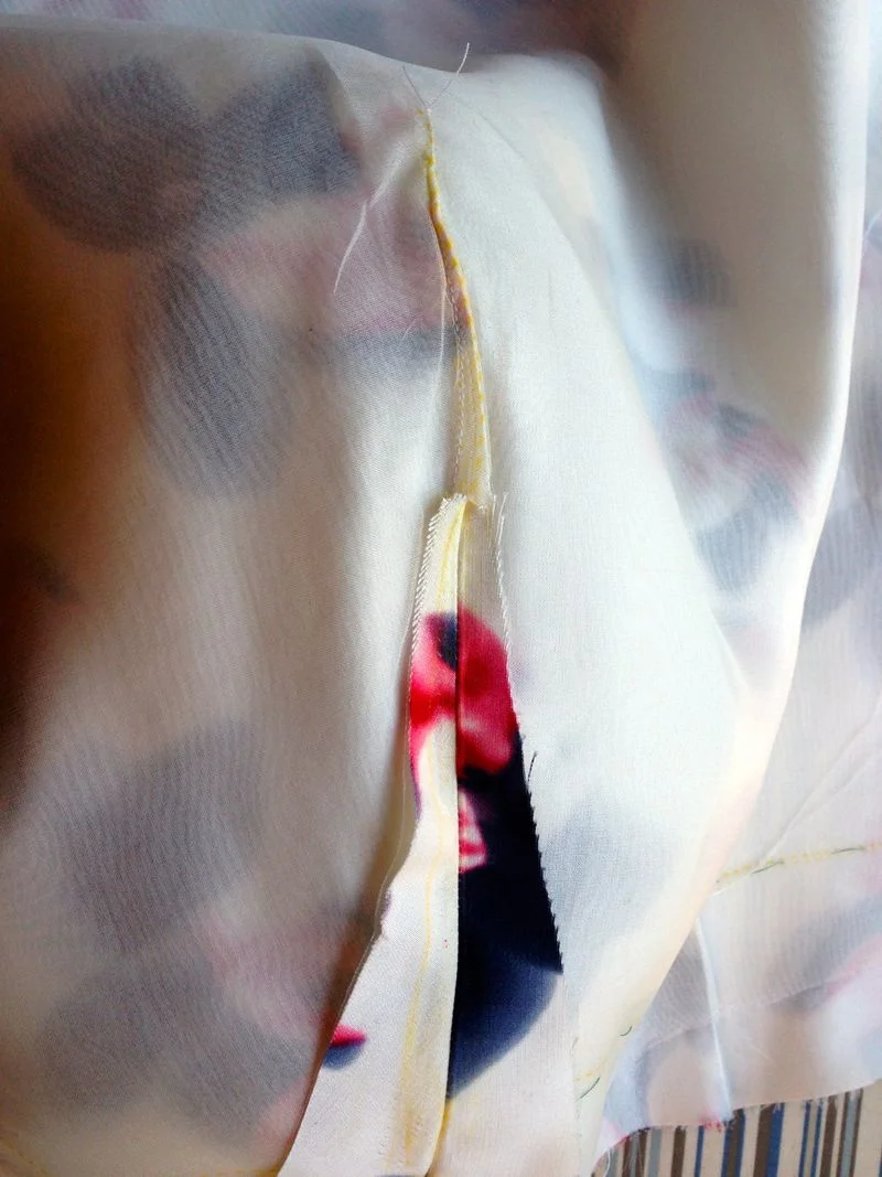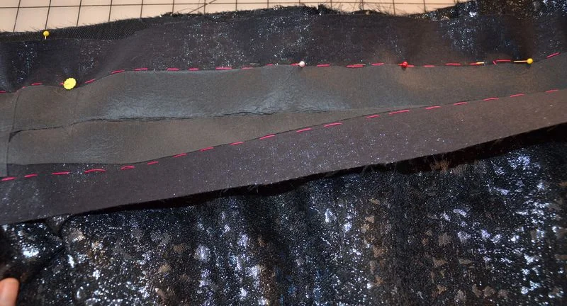 The skirt is cut on the right side of the fabric and I added a underlining of silk organza to both skirts, then thread basted the seam markings joining the two together. I used a lightweight iron on interfacing for the waistband.