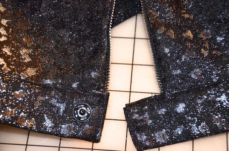 I used a metallic all purpose 7" in the brocade skirt, letting the teeth show and added a tab at the top of the waistband.