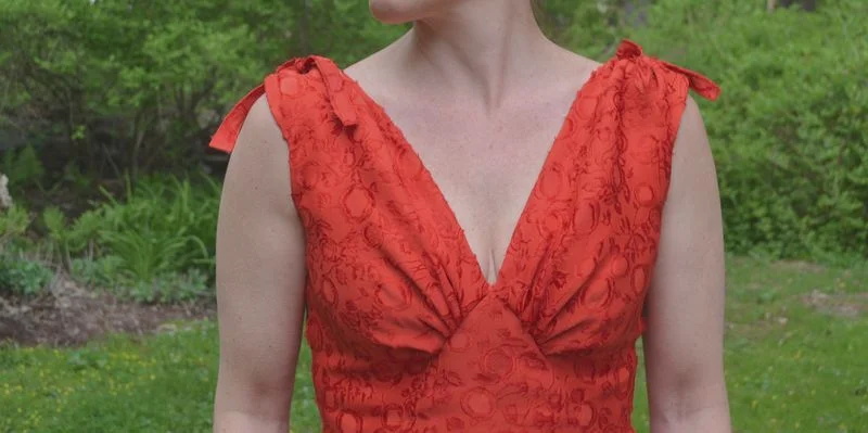 I would highly recommend this pattern as a straighforward sew. Marfy have marked it with lots of details and there are no tricky fit pieces. There are two front bodice, two back, one tie to be cut twice, one single bodice and skirt front panel, two side and two back skirt panels with a center back seam and zipper.