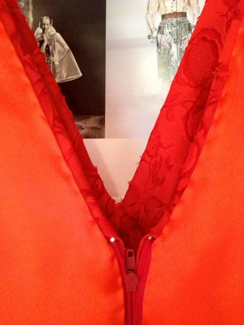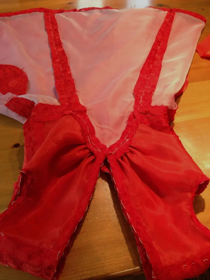 The whole dress is fully underlined with a silk organza, the circles in the fabric had a net backing so I used a orangey red organza for the upper bodice as it has little ease and I was concerned that a lighter colour would show through and stuck with white for the lower knowing the lining would compensate.