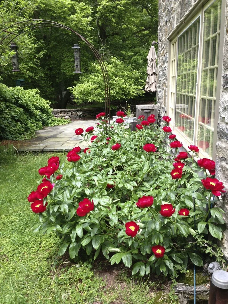 The upside to buying a very old barn are the established flower beds and trees....these peonies are the size of two cupped palms, right outside my sewing room window