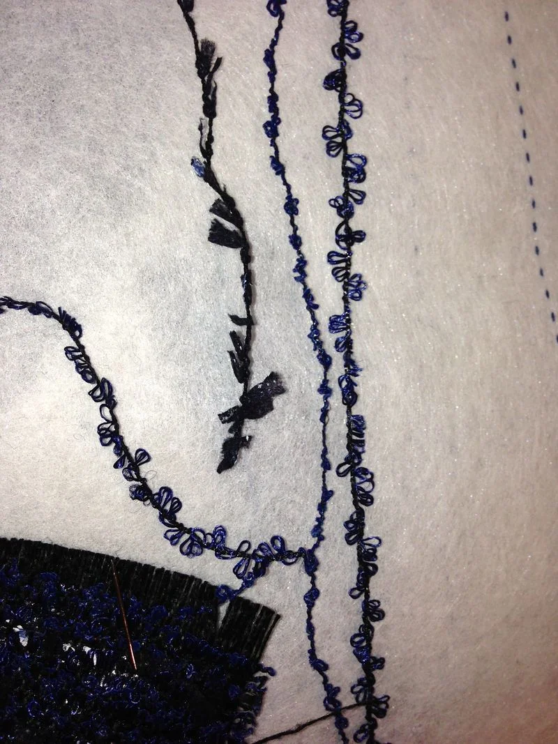 I know there are always questions about why these kind of designer fabrics cost so much, but just look at what it consists of....yards and yards of these strands.Its kind of mind blowing! The three different sizes are woven into the black thread which is on the straight grain. The smaller is black and has flecks of white embedded into it randomly, the other two are similar to each other but different sizes.