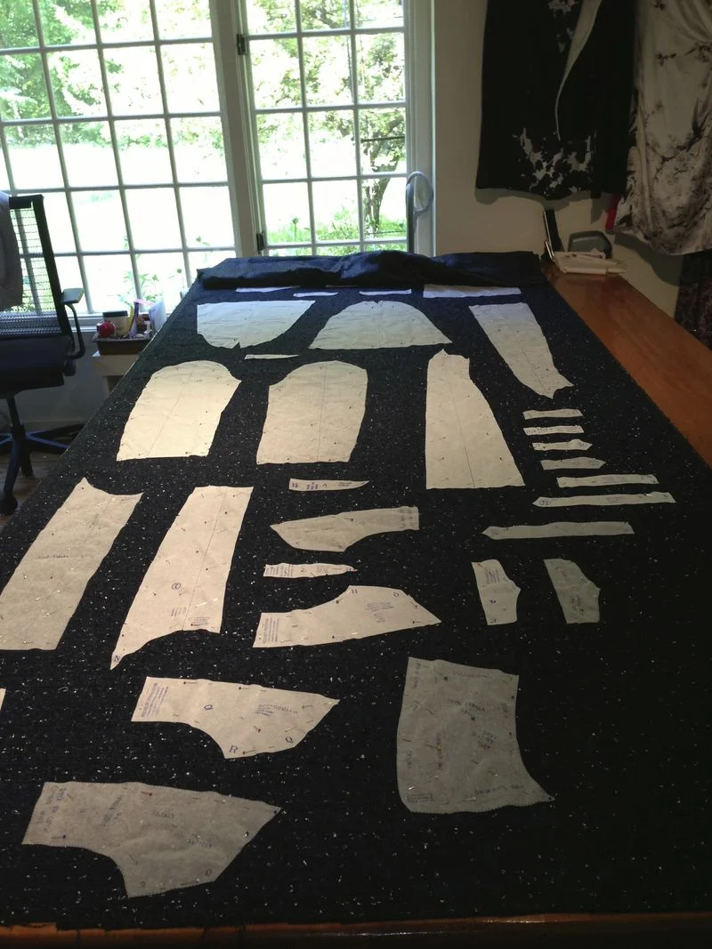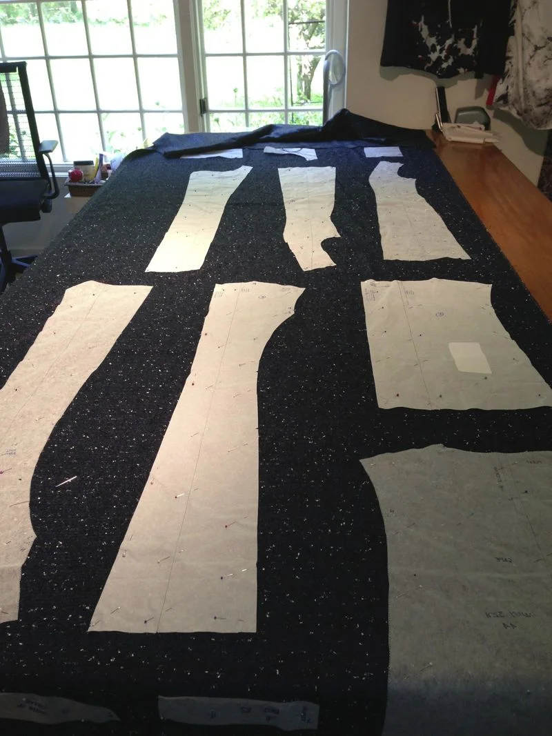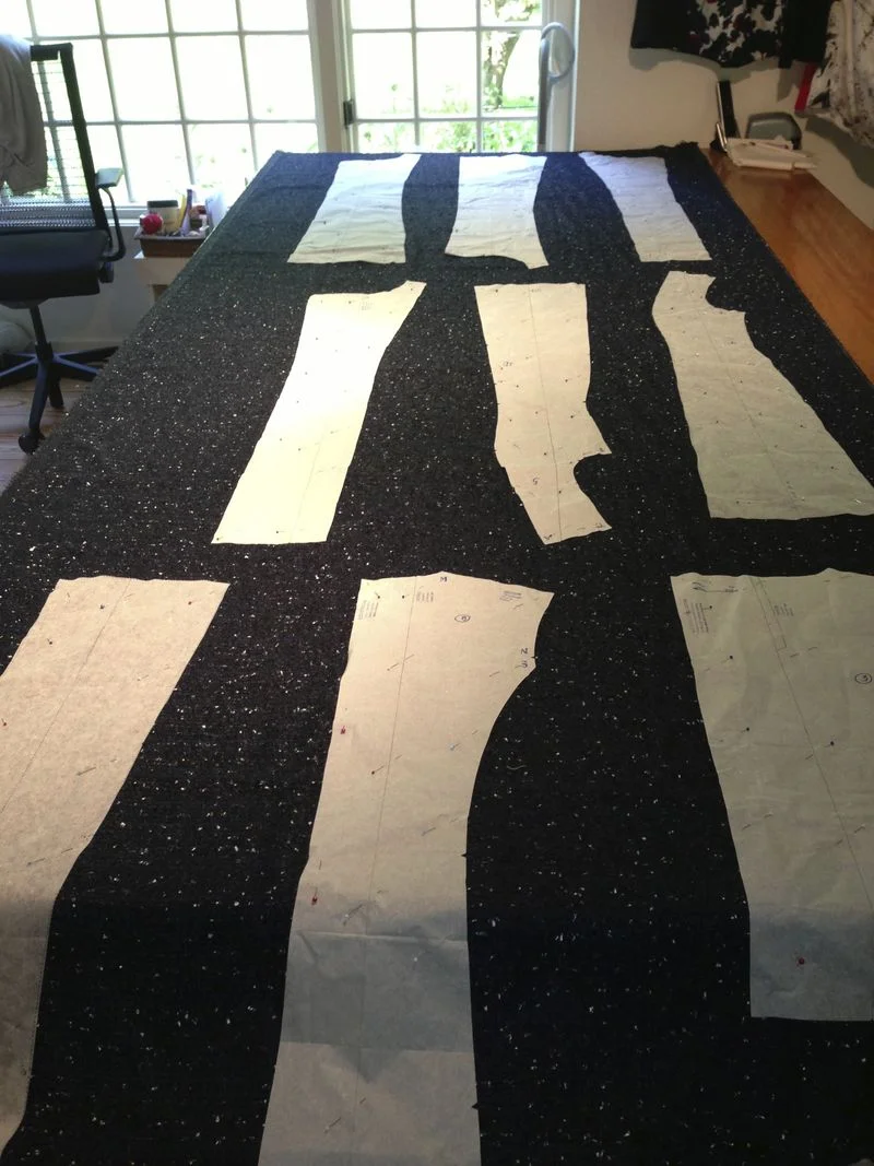 This coat took a full six yards of fabric with just fistfuls left but it was a very narrow 46" wide. This is the entire pattern laid out end to end... I have held onto all the selvedges in case there is a way of "Chaneling" it up when I finish!