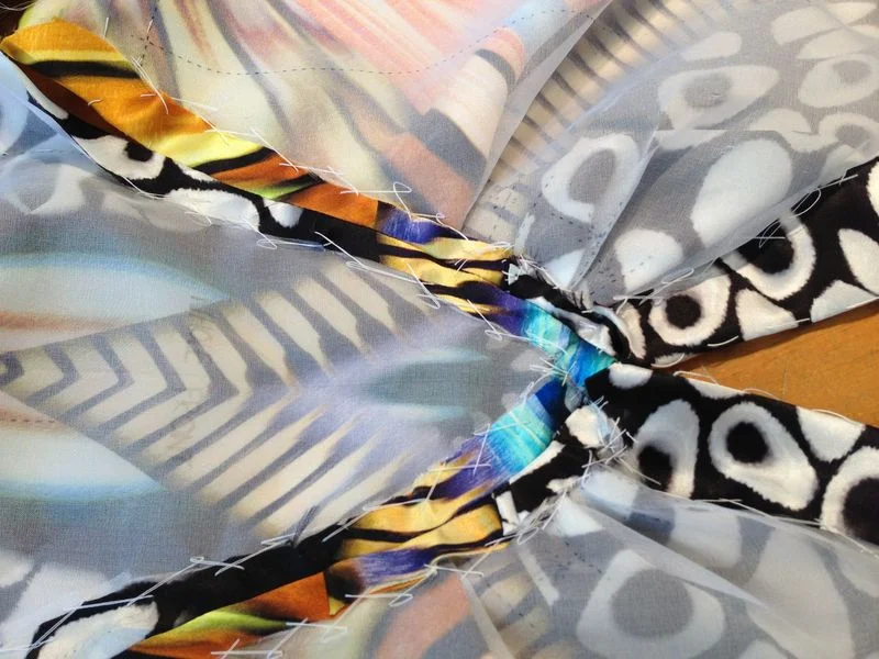 The front took way more time than I imagined, there are a row of pleats on each front panel which distorted the look I was aiming for so I kind of moved the folds around to keep the main detail cohesive.It also helped stop the front from being as low cut as my white cotton one . I really like it, no need to wear a necklace with this!! I had to turn the print upside down but did manage to keep it on grain to match the front skirt panel.