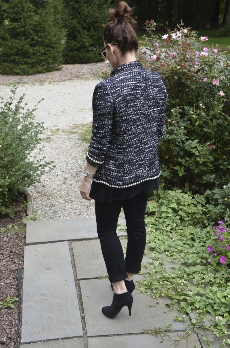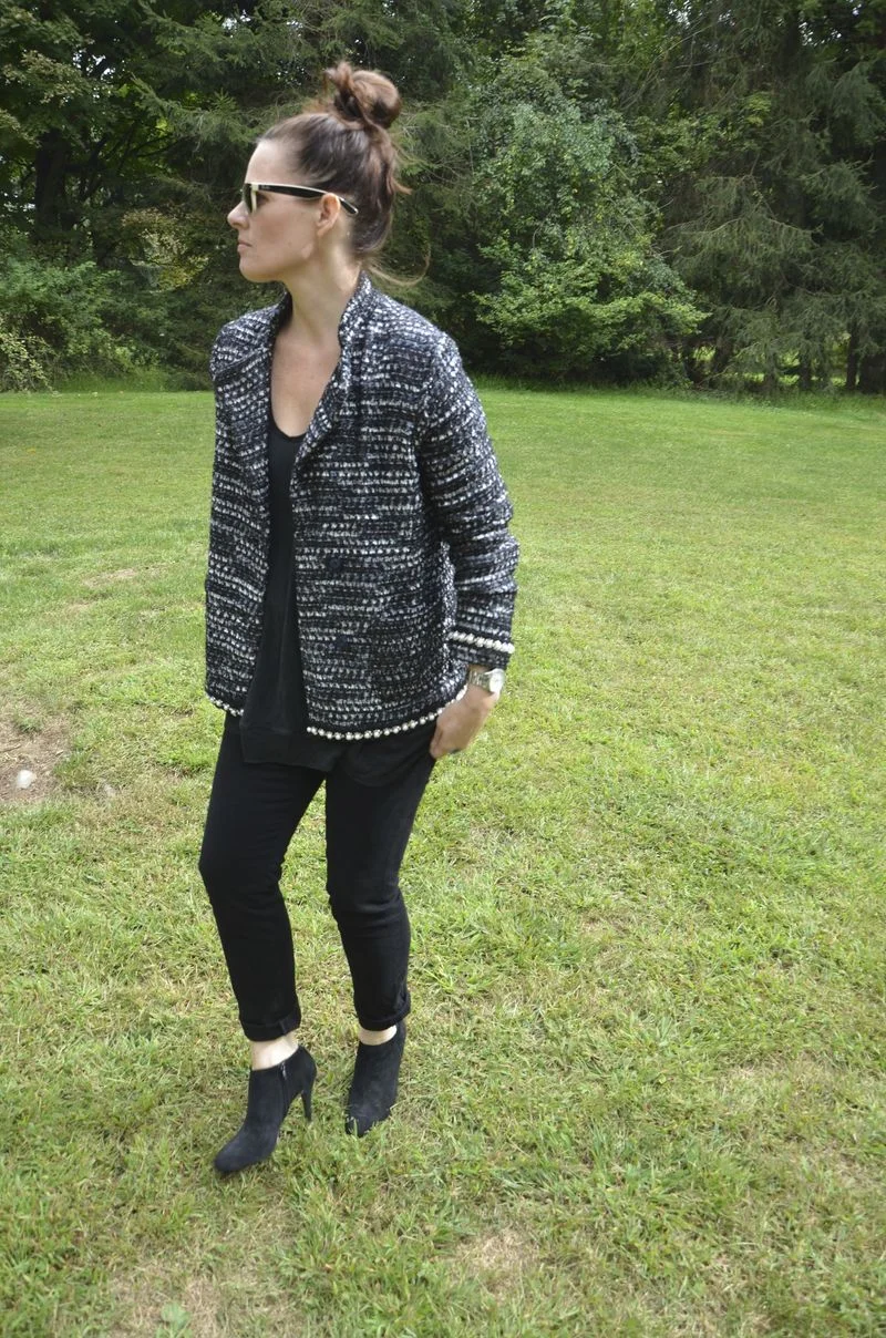 I kept it simple by adding a couple of inches to each side of the front facing, removing an inch from each side of the center back and removing two inches from each sleeve, so that the front would give the illusion of slouch but the rest would look tailored and very fitted....