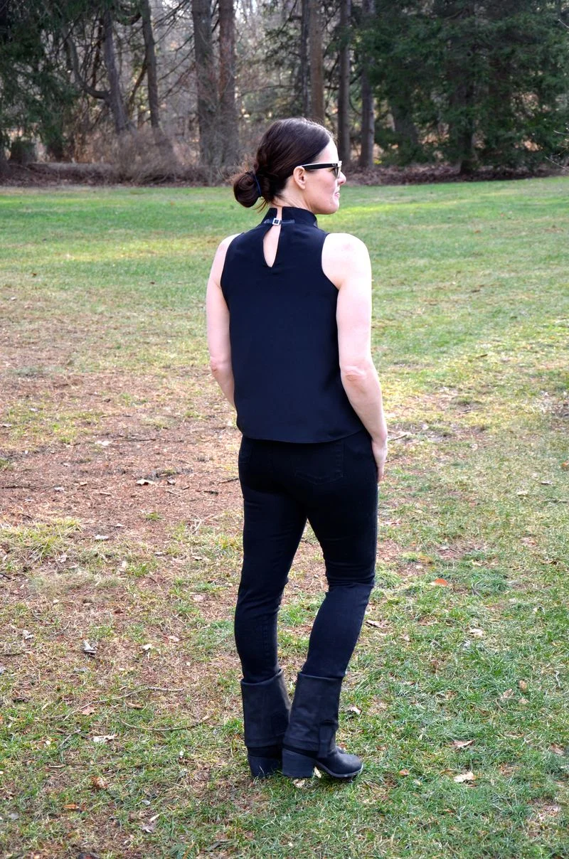 The armseye should rest comfortably under your arm and angle at the shoulder for a flattering silhouette. The back of the armseye should fall in a gentle curve from shoulder to underarm.