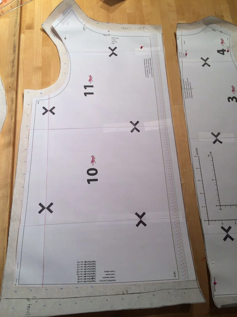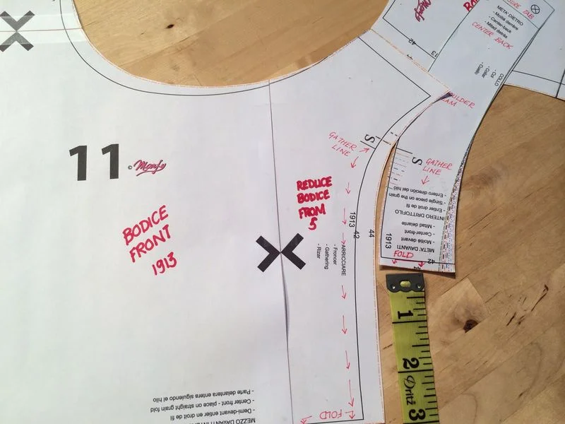 I always start by pinning the half paper pattern to either my dress form, or by laying it flat on the table and then I begin to make notes based on my first impressions , normally directly to the paper pattern. Where are the darts, pleats, folds? how does the bodice fit, which piece goes over what?