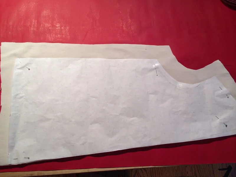 After pinning your paper pattern to the fabric on the fold, cut big chunky seam allowances roughly all the around and then trace the underside of your muslin with carbon paper...available here here and here by laying it onto the carbon paper.