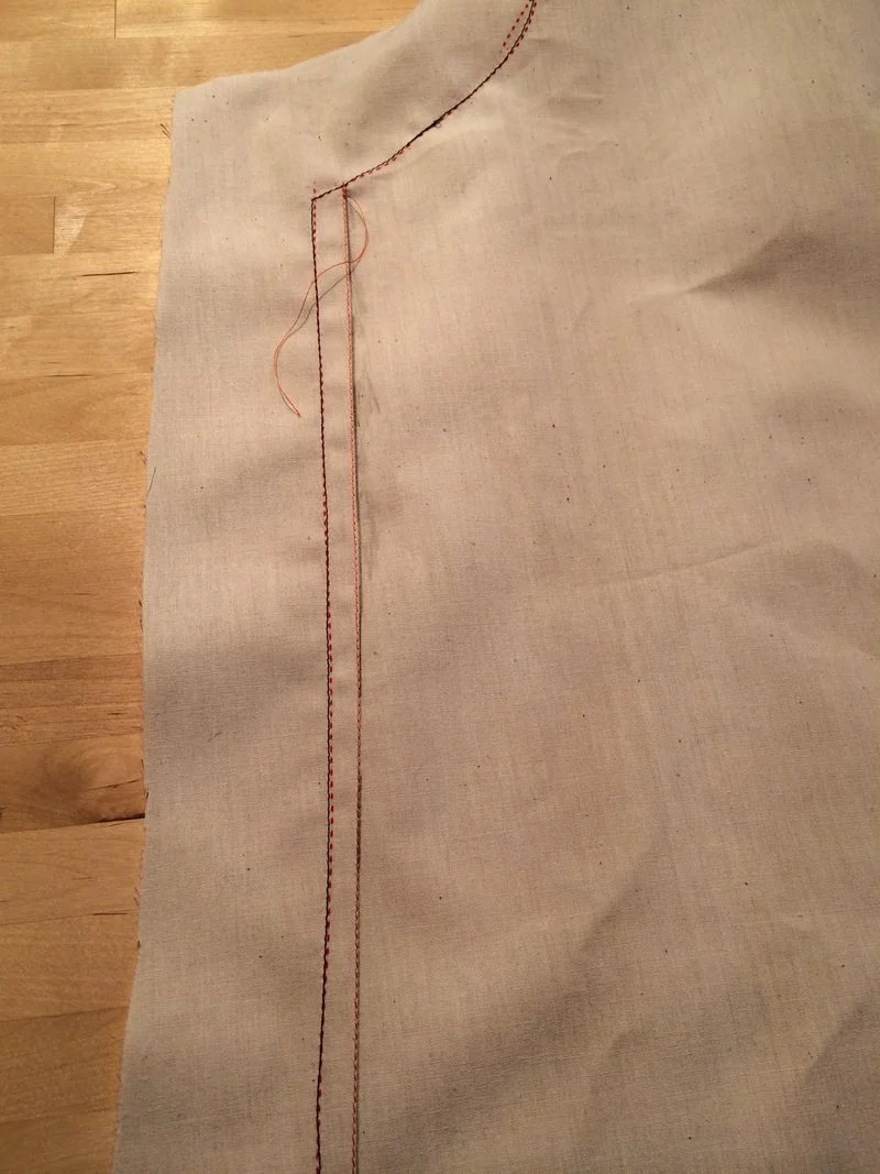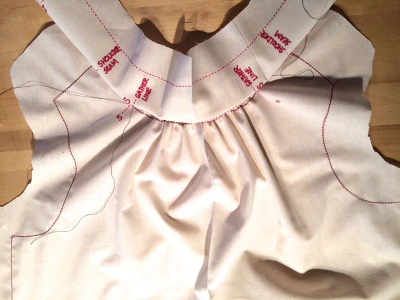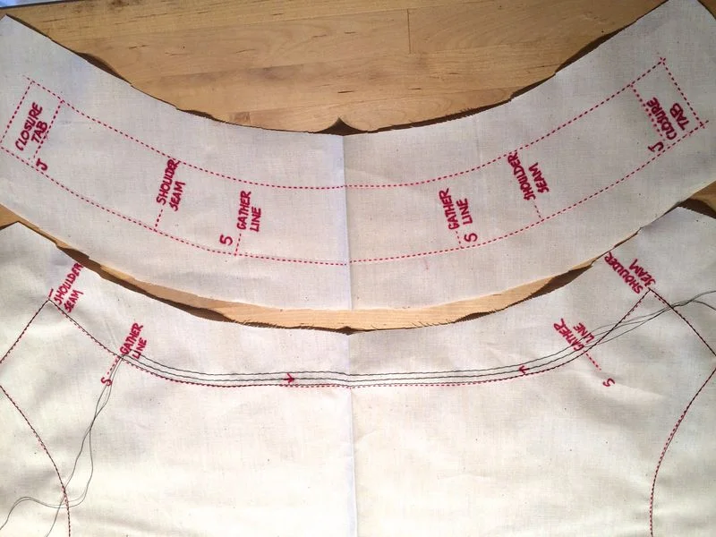 When it all fits nicely and the gathers are reasonably even, remove the collar pins, tie off the tails and sew the back side and front side of the bodice together, then the shoulders and finally the collar piece using a large basting stitch.