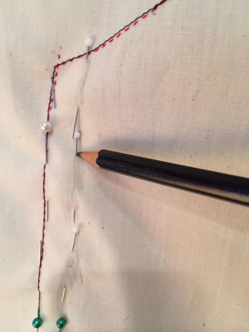 When you have made your fitting adjustments, using pins to mark the new lines , run a pencil roughly alongside to mark them.