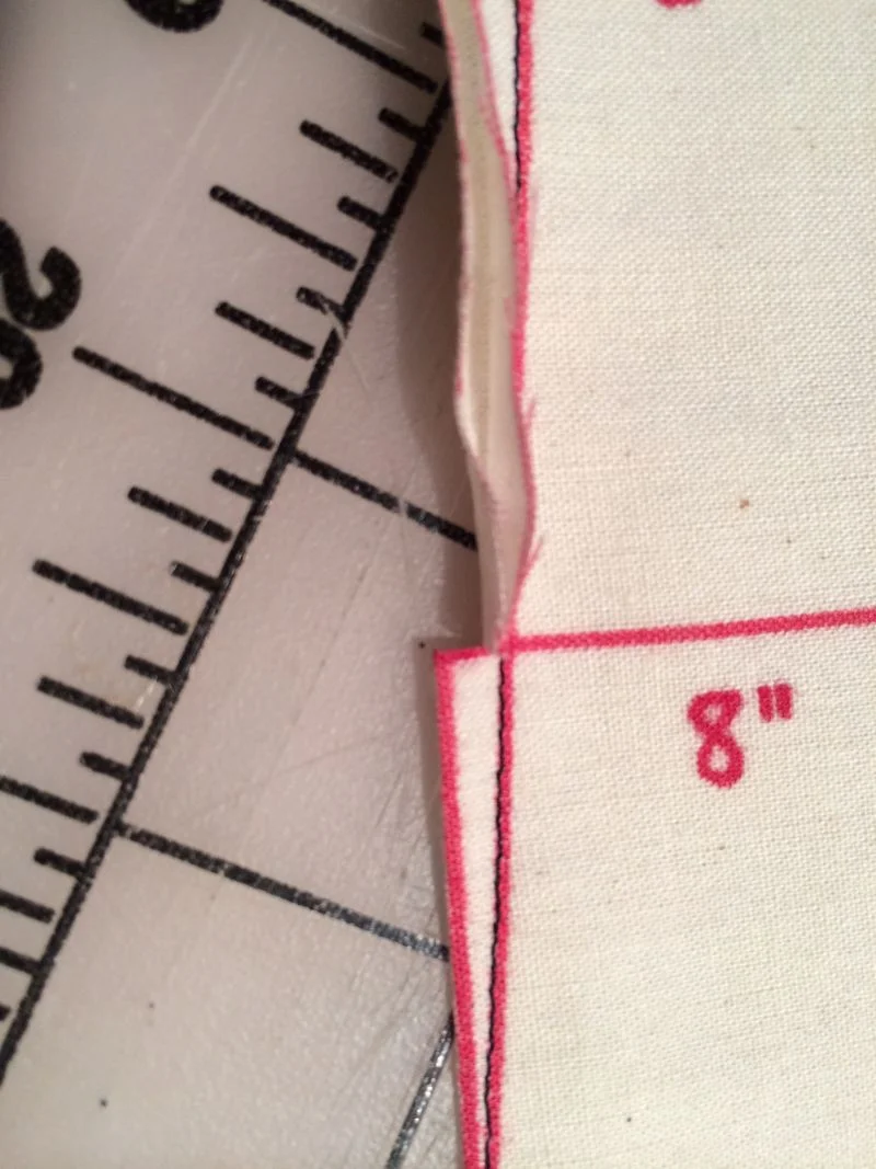 Now snip very carefully almost into your stitching line at the 8" mark so that you can open up the seam and lay it flat.