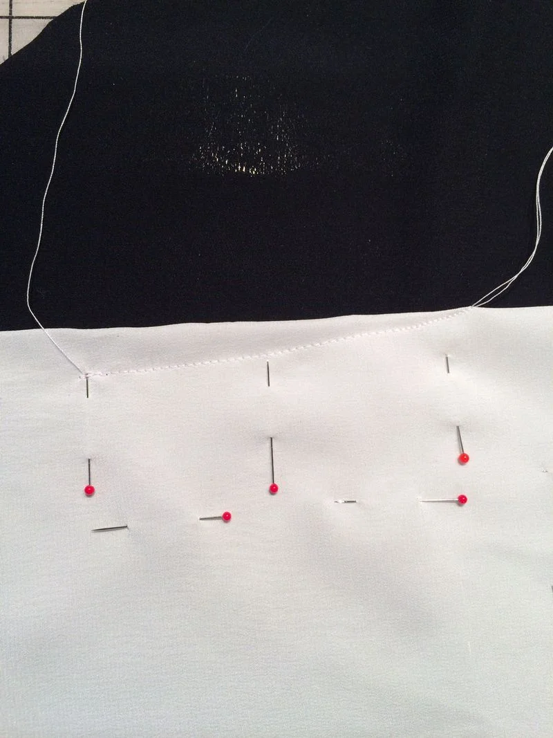 and leave as many pins as possible in your fabric above your stitch line while you sew. You are trying to stop the grain from moving when you lift the garment off your cutting table and carry it to your machine. Lots and lots of pins will help keep it stable and on grain.