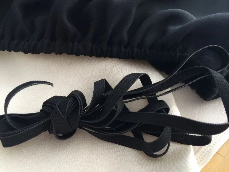 Its uses a very small casing which lends itself nicely to the design, pulls the fabric sufficiently to shape the gathers but is not so tight that it creates a poufy effect (tech term!) and does not stress the fabric in anyway...