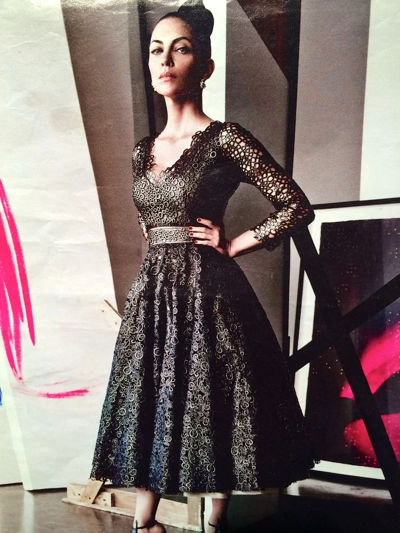 A couple of years ago I pulled this image from a magazine, loving how the feminine silhouette had been hardened by the dark lace..and have had it pinned to my sewing room wall ever since.