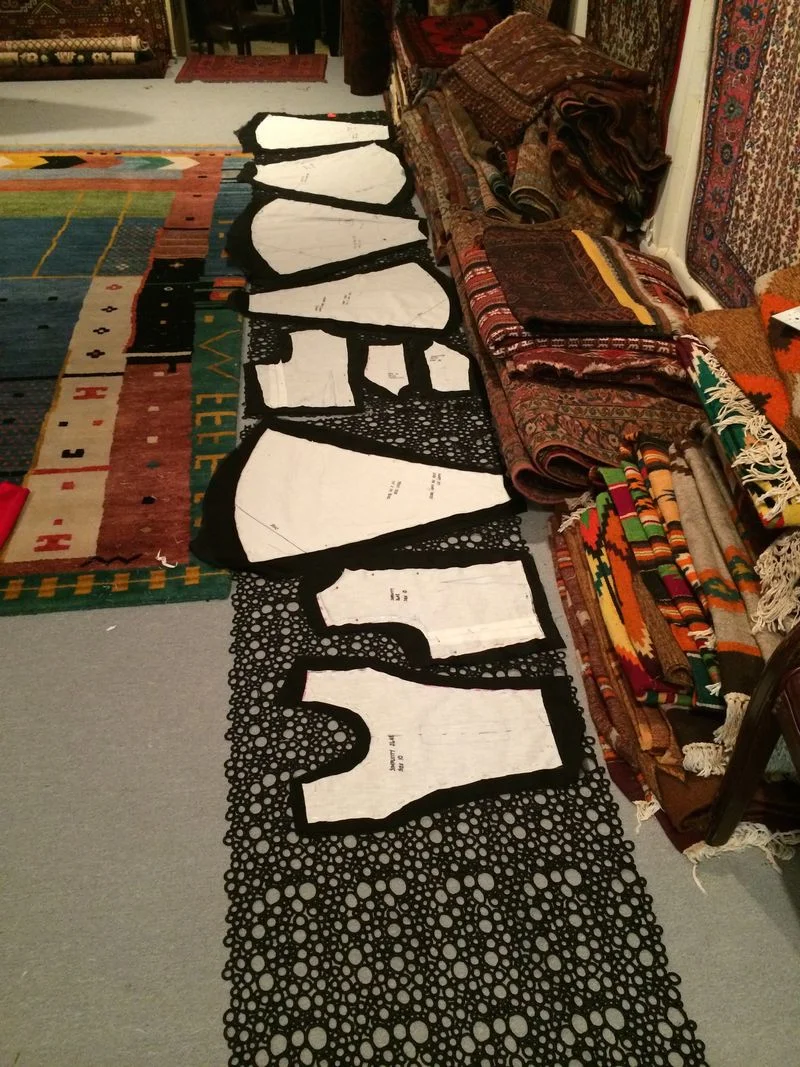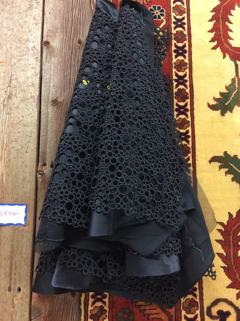 Again, as with my embroidered organza skirt, there was no grain line as such because the fabric was so heavily embroidered and stiff and the repeat pattern so minimal, I was able to lay it out on the rug gallery floor and cut as I wanted...which for me was to make sure I had the bulk of the scallop on the hemline.