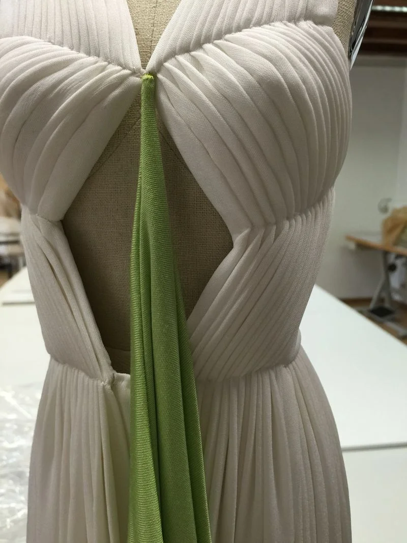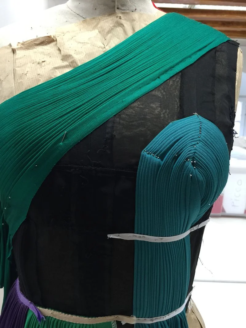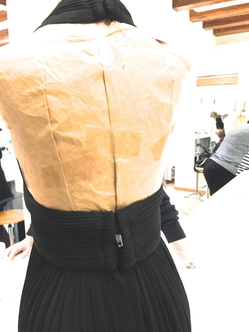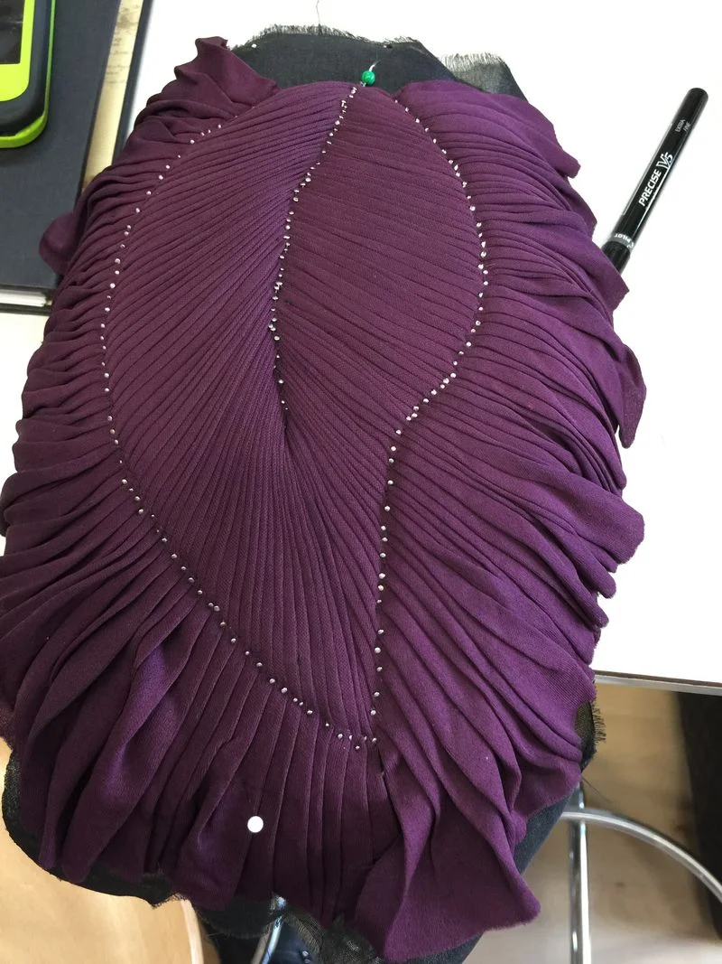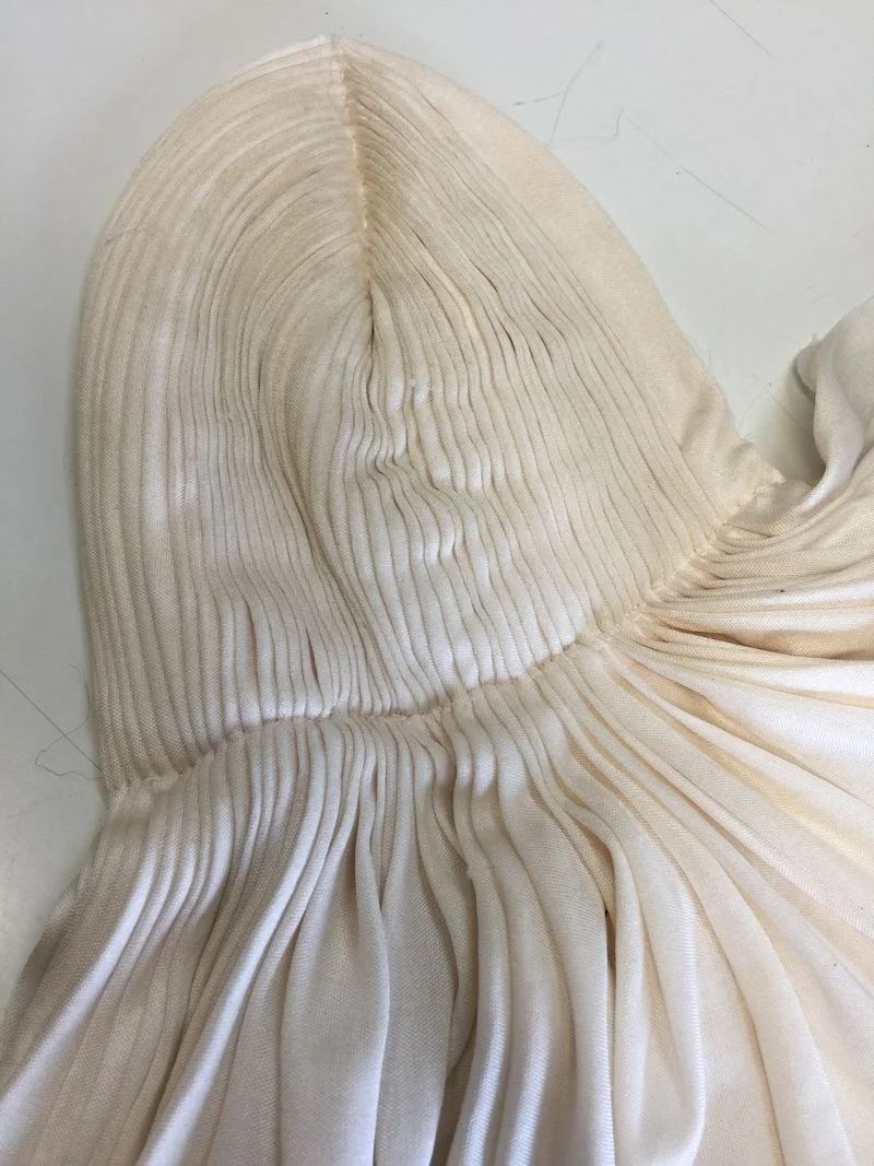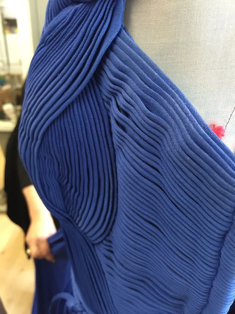 Once the pleats are completed and all are the exact same size, the fabric is transferred to the dress form.