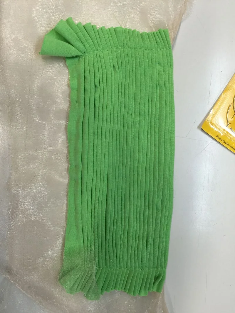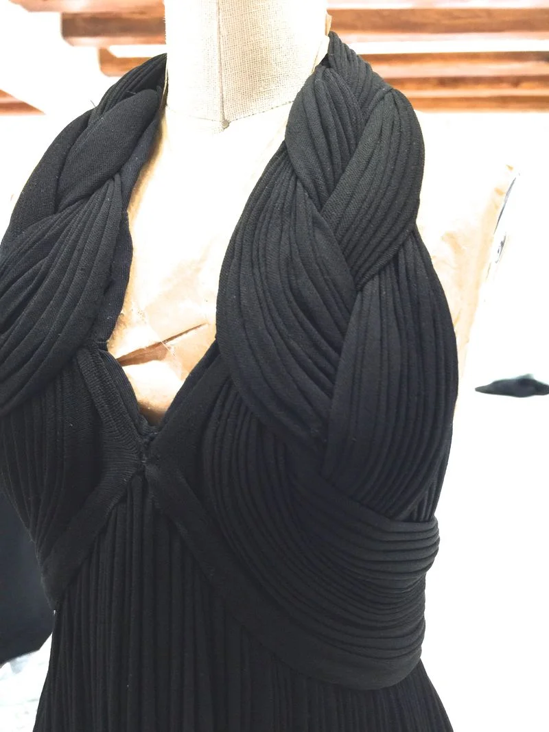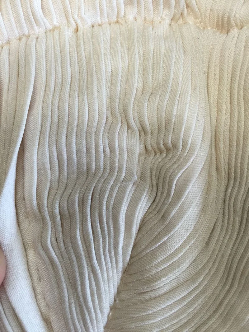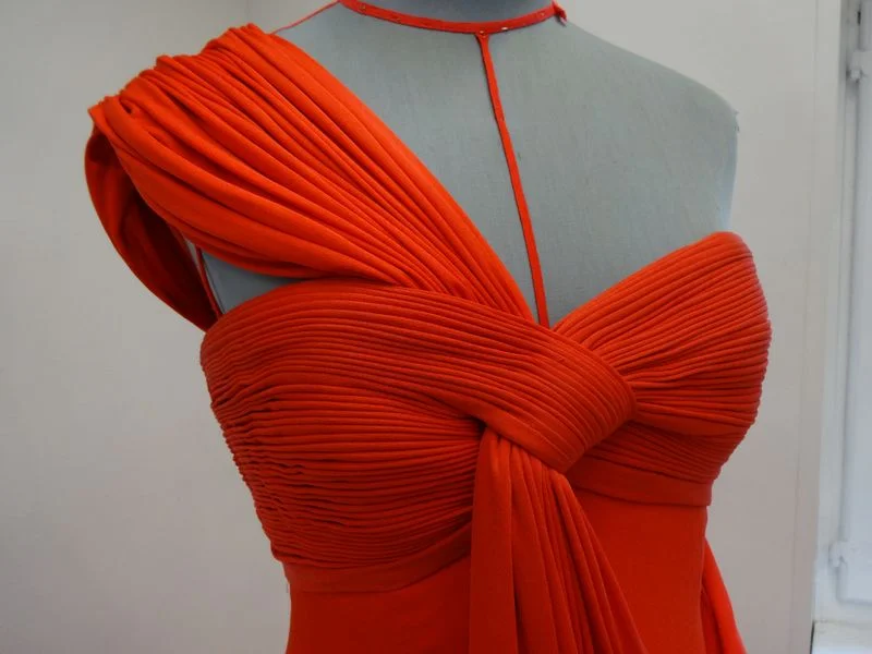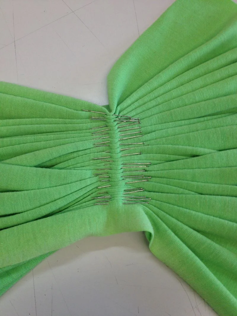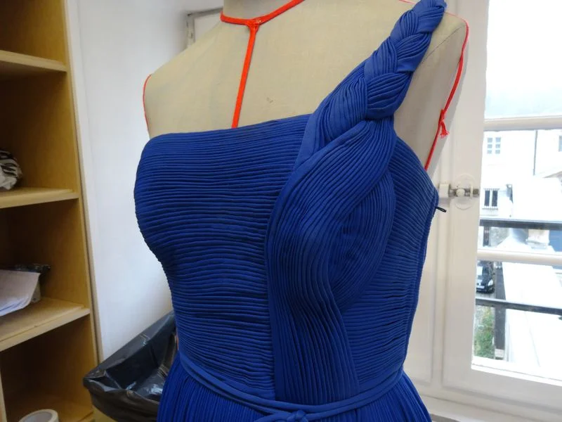 Once the pleats are completed and all are the exact same size, the fabric is transferred to the dress form.
