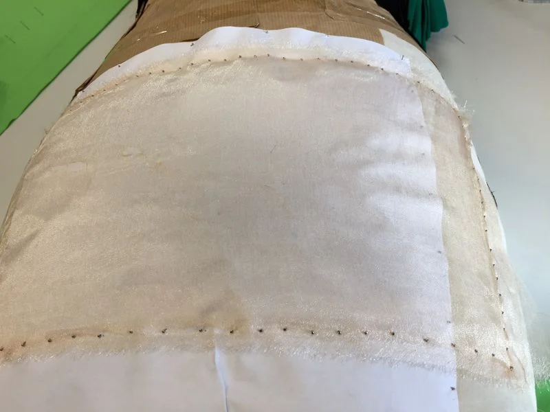 The paper is placed on the dress form, and pinned very tightly adding folds or darts until it lays flat and then the organza is pinned in place on top, again pulled until it is perfectly flat.