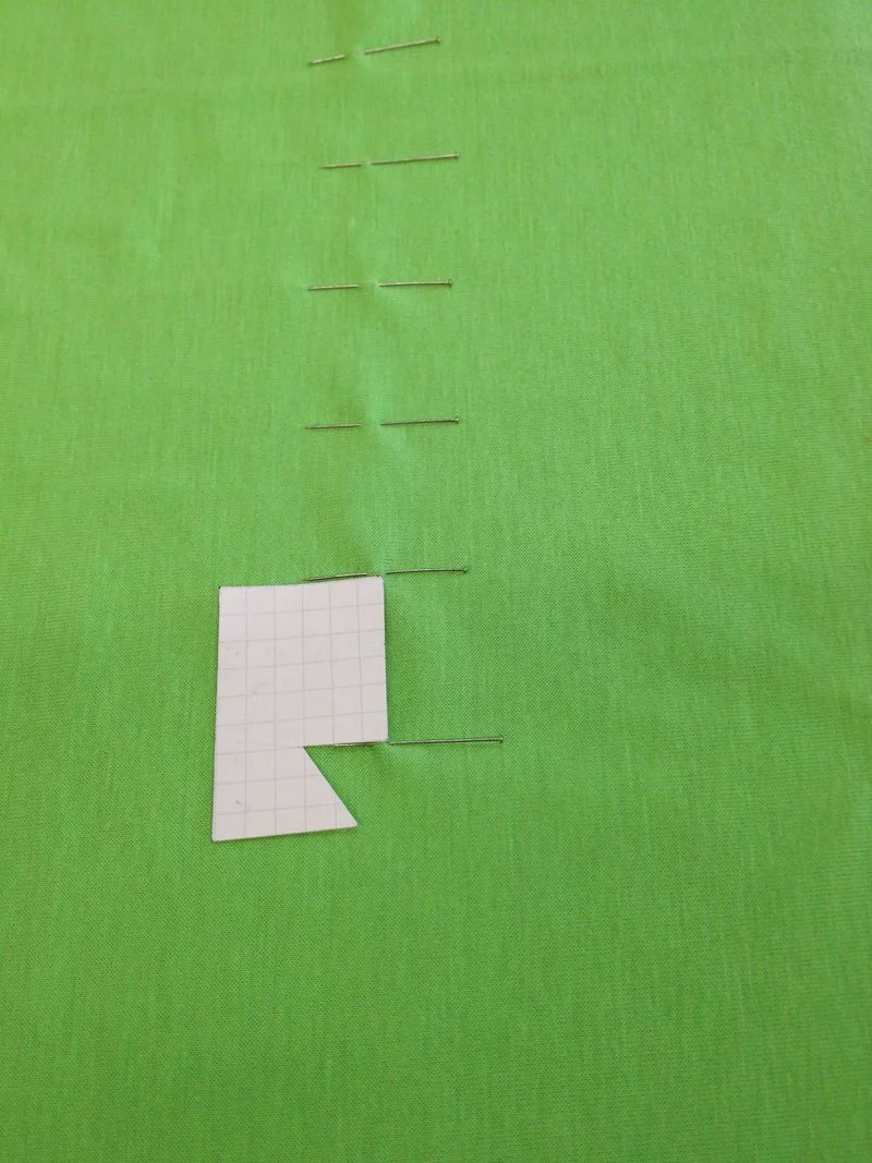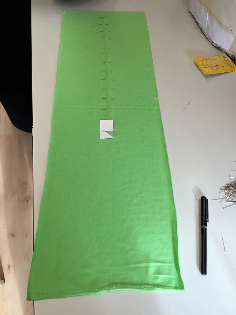 Then a large strip of jersey is cut and laid flat on the table...and using a cardboard guage for accuracy, pins are placed every 1.5"