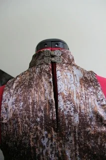 She underlined both collar pieces with silk organza and machine basted them in place. Used the couture method for the back opening and a hairline seam for the shoulder seams, but found it was a bit to stiff with all that machine stitching so opted for a french seam down the sides. Hand stitched the collar closed on the inside using a wee fell stitch and for the armholes, thread stitched first then folded twice and hand stitched so it would have a flexible fall to match the fabric.