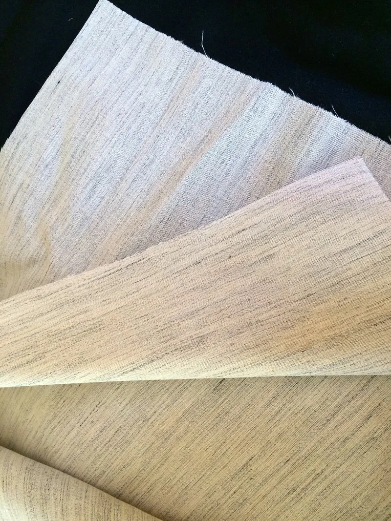 Below is the real deal, pure 100% hair canvas. It feels like thicker stiff linen but is very soft and while it rolls easily, it does not fold without huge creases......its kind of gorgeous actually :-) This is $15 per yard and 21 1/2" wide.