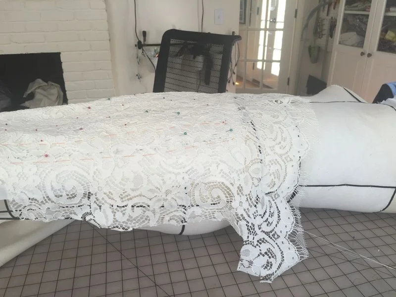 and once all that lace is pinned and smooth, the form can be removed from the stand and laid flat on a desk... having it laying flat makes sewing basting lines so much easier than when the form is upright.