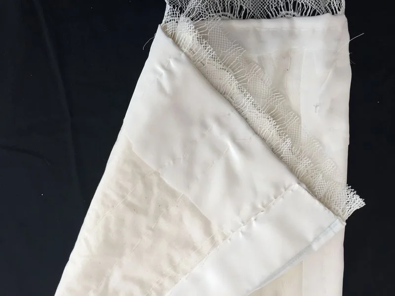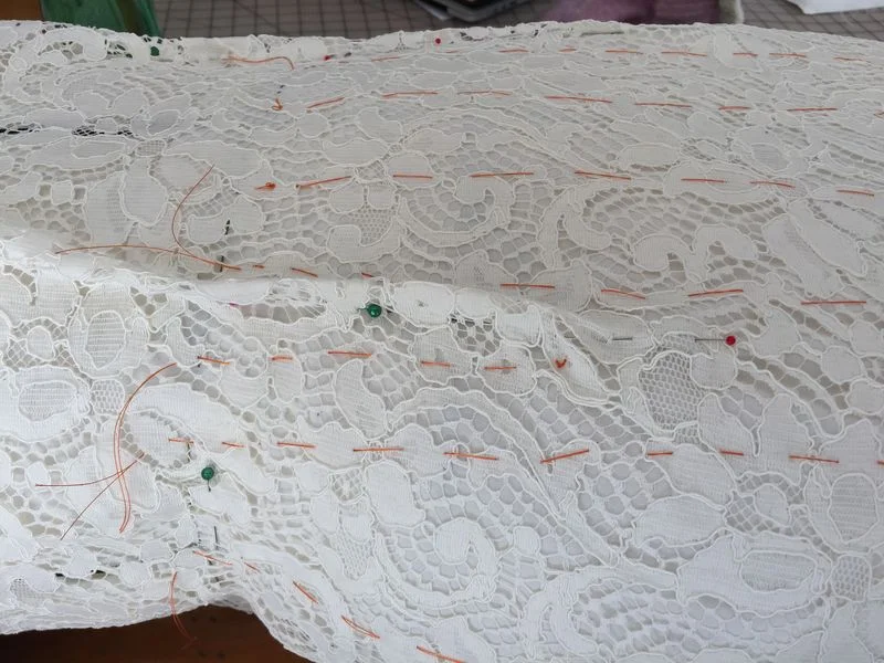 The lace has to be joined using lines of handstitching so the three fabrics (muslin, silk, lace) make a single fabric, but it can't be laid down or sewn flat because of the curves of the hips, thighs and waist.