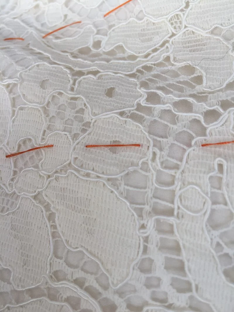 and because this lace has re-embroidered cording, I was able to use that to hide my stitches, hooking each tiny stitch over the cord and then popping up 1/2" or so later following the orange lines to some extent. When I finish a line, I always place a pin at the top and bottom - its easy to go back and re-sew the one you just finished again otherwise, trust me!