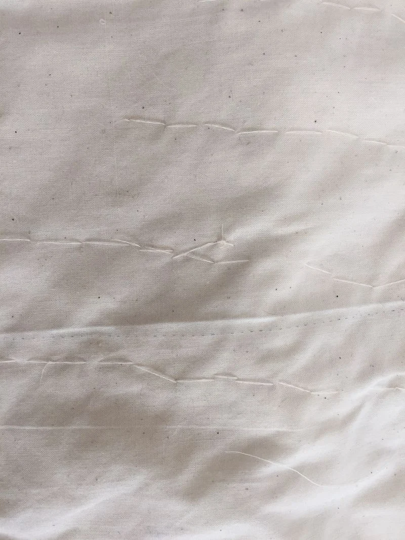 Once the two fabrics were joined (muslin behind/silk on top) I sewed the right hand seam with a 2.5 stitch from top to bottom leaving the left hand seam open.