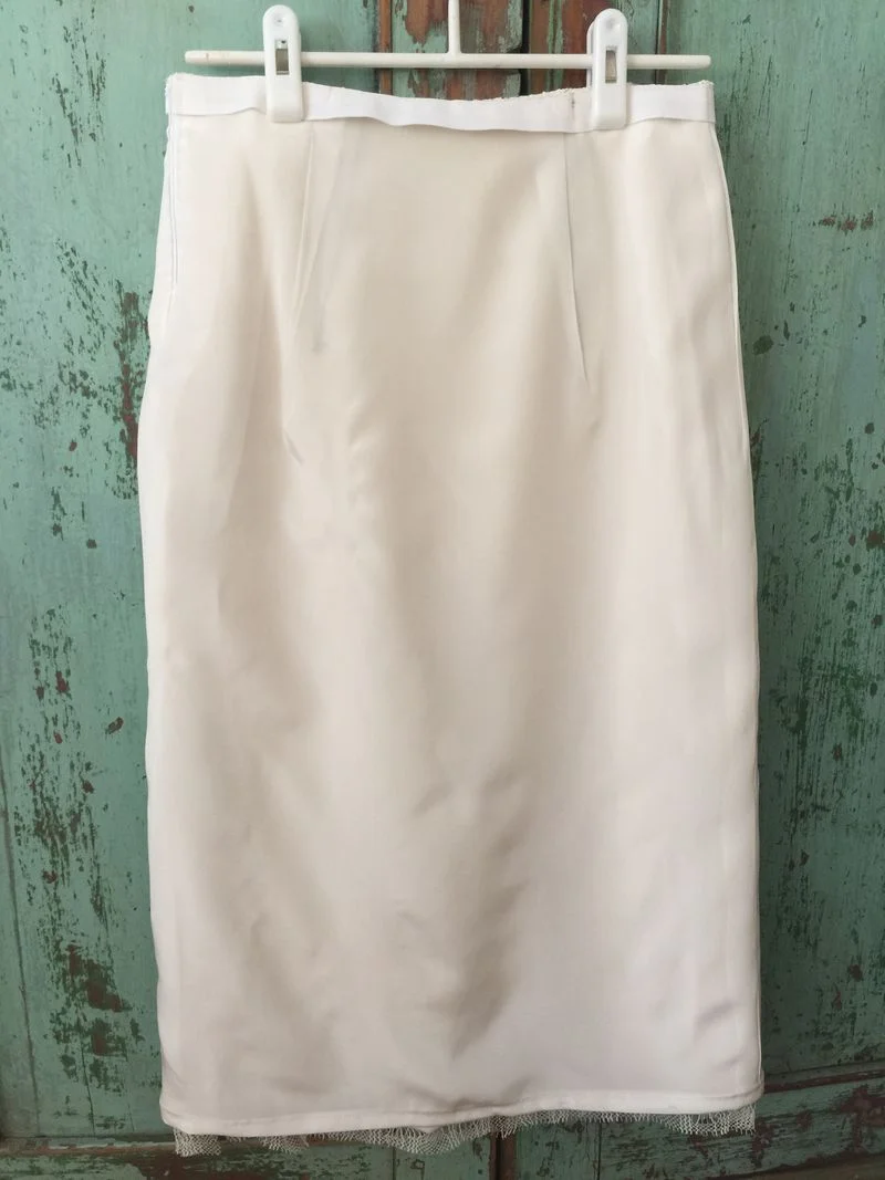 Finally, I stay stitched a silk charmeuse lining to the waist seam at the top and then attached a Petersham ribbon to that line stitching on the outside, flipping it over, cutting away the excess layers underneath and machine stitching the ribbon at the side seams and darts to hold it in place.