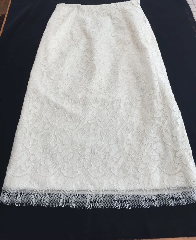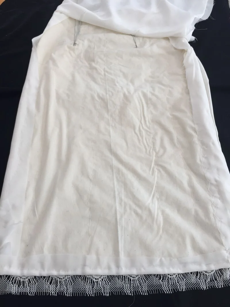 But it all looked good, so I opened it up again, laid it flat on the table and got on with the job of sewing down the lace from mid thigh to hem...