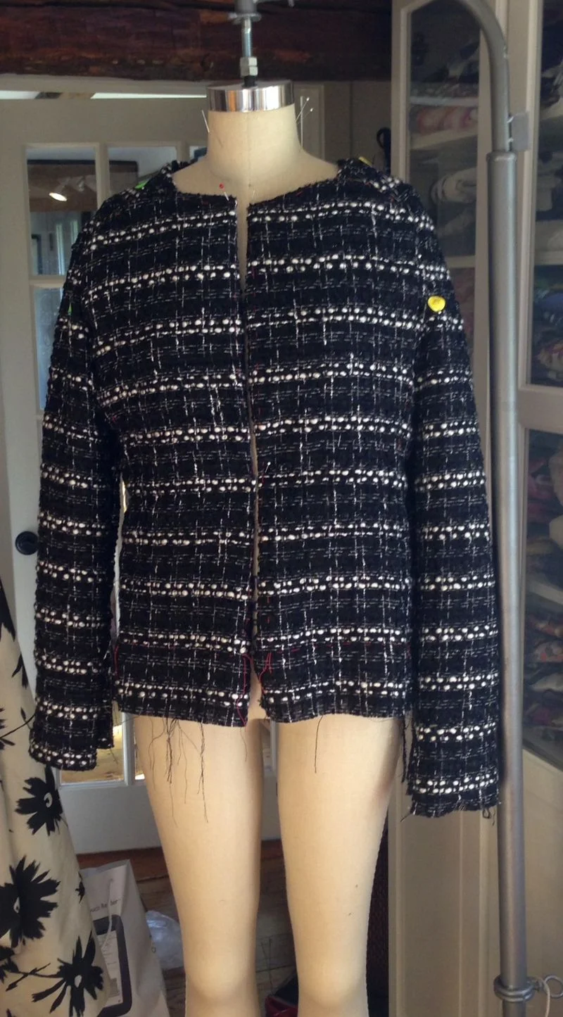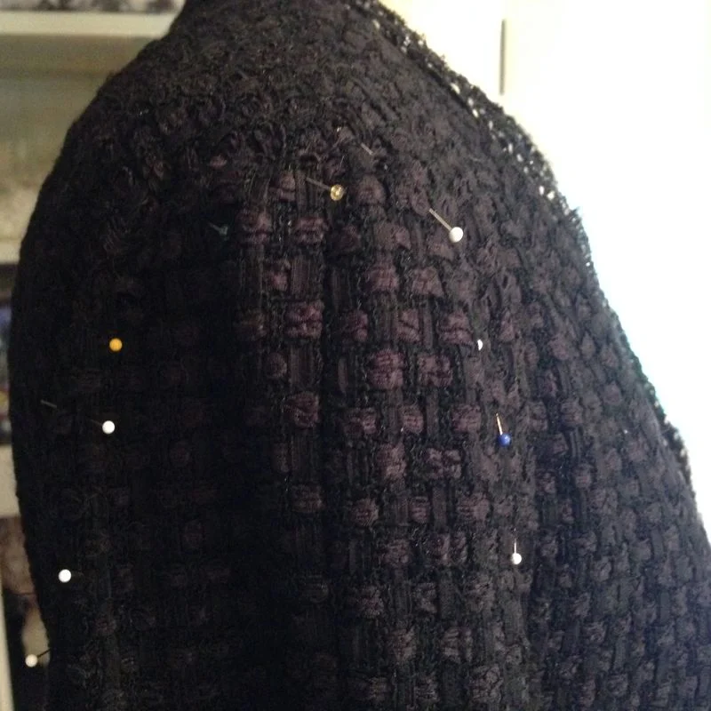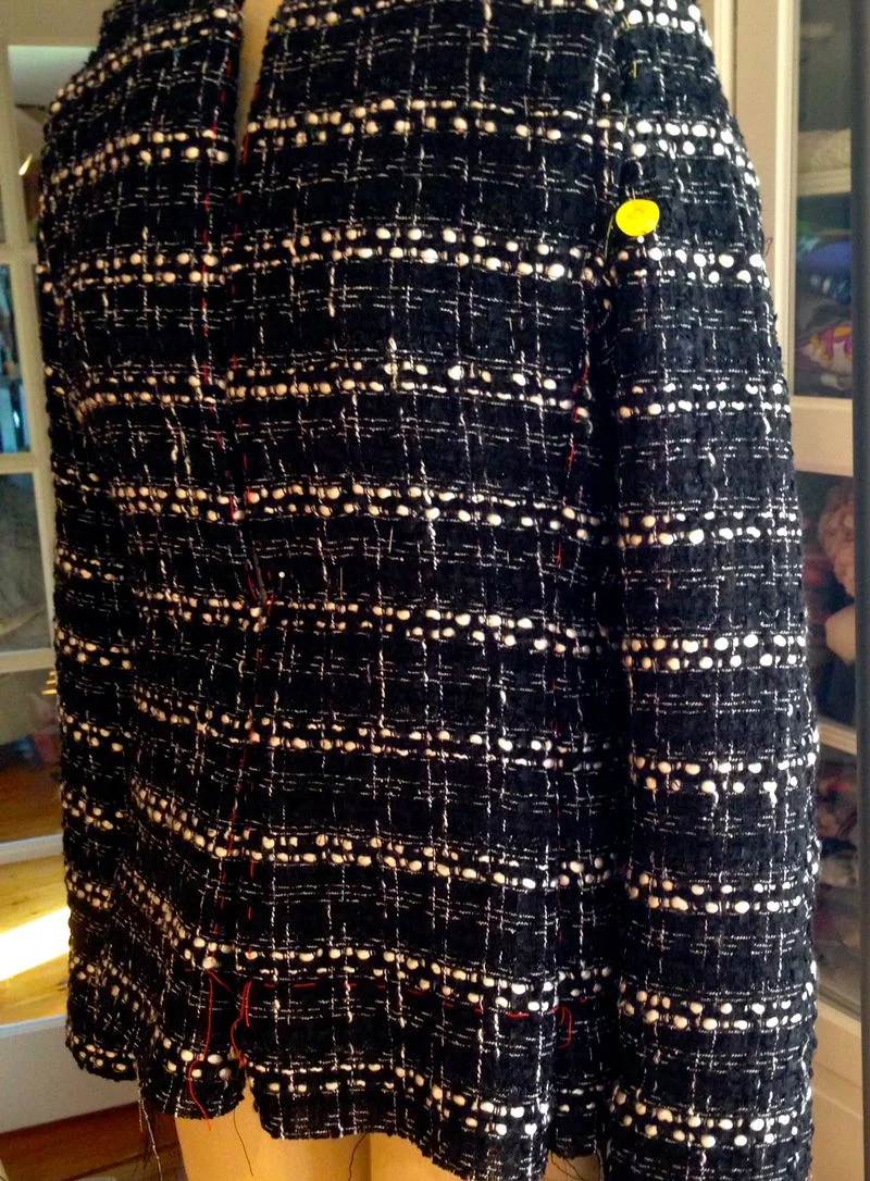 and when everything is in place, put that baby on! Don't be surprised if it feels tight or "off" at first, its got linings pinned and seams open everywhere....nothing should be graded or steamed yet....your body heat will help make the wool relax after a minute or two and this helps settle things down...