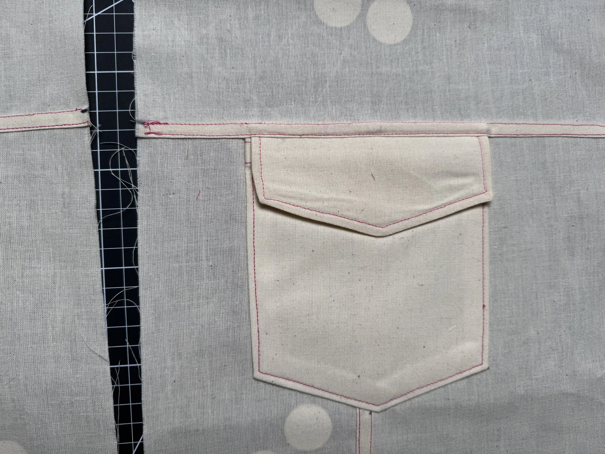 Stitch the flaps with a 1/2โ seam allowanceโthis can be in a neutral or top stitch thread. It wonโt be seen again but it does help to keep the pocket flaps in alignment with the main pocket.