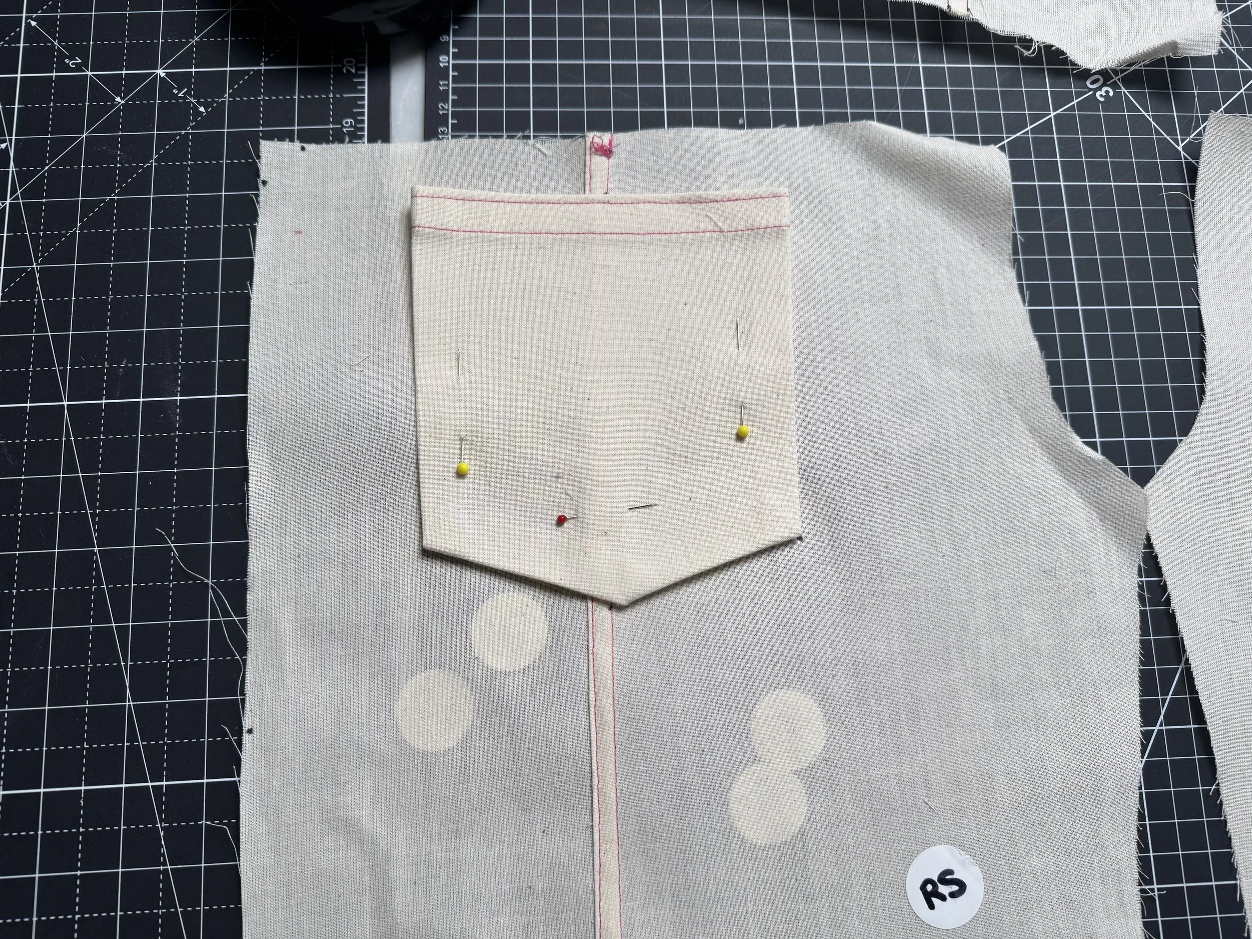 Pin the pockets in place, making sure that the point of the pocket is not on the flat fell seam. It is designed to sit off to the side of the flat fell seam to reduce bulk.