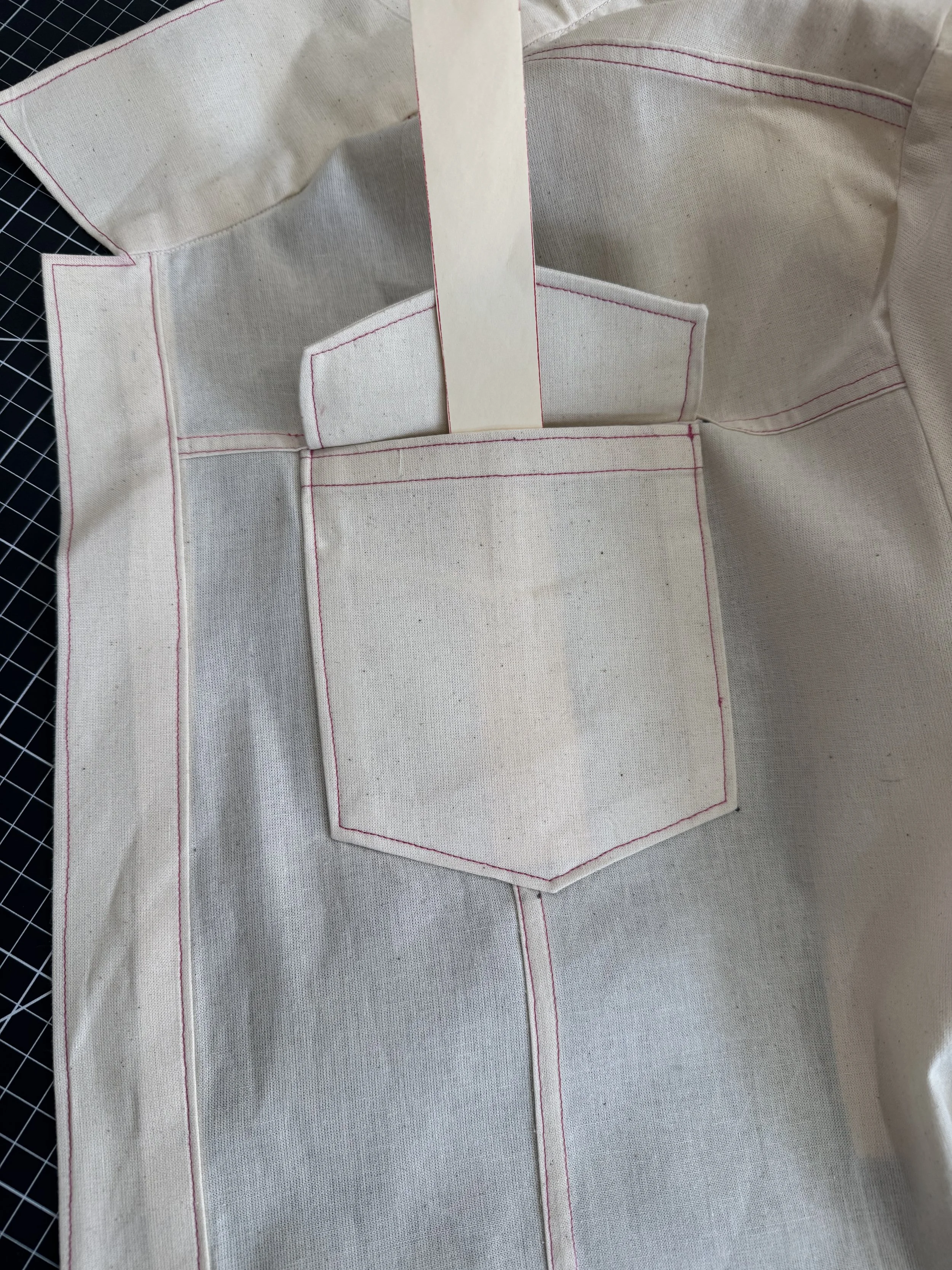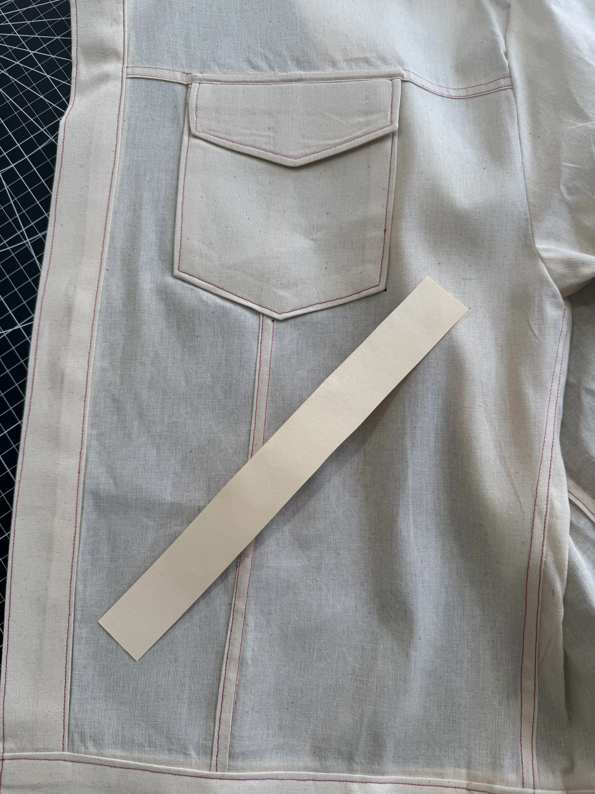 If you are using a heavyweight or plain fabric, I would also suggest cutting two-inch by 6-inch strips of card or oak tag and using those to stop the heat from imprinting the fell stitch or the under seam on the pocket as you press.