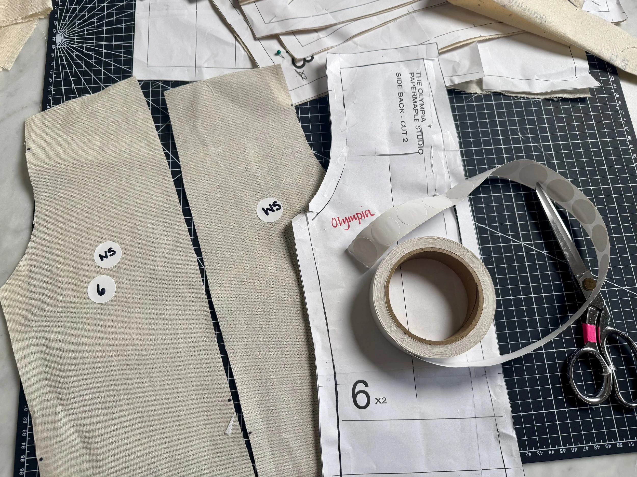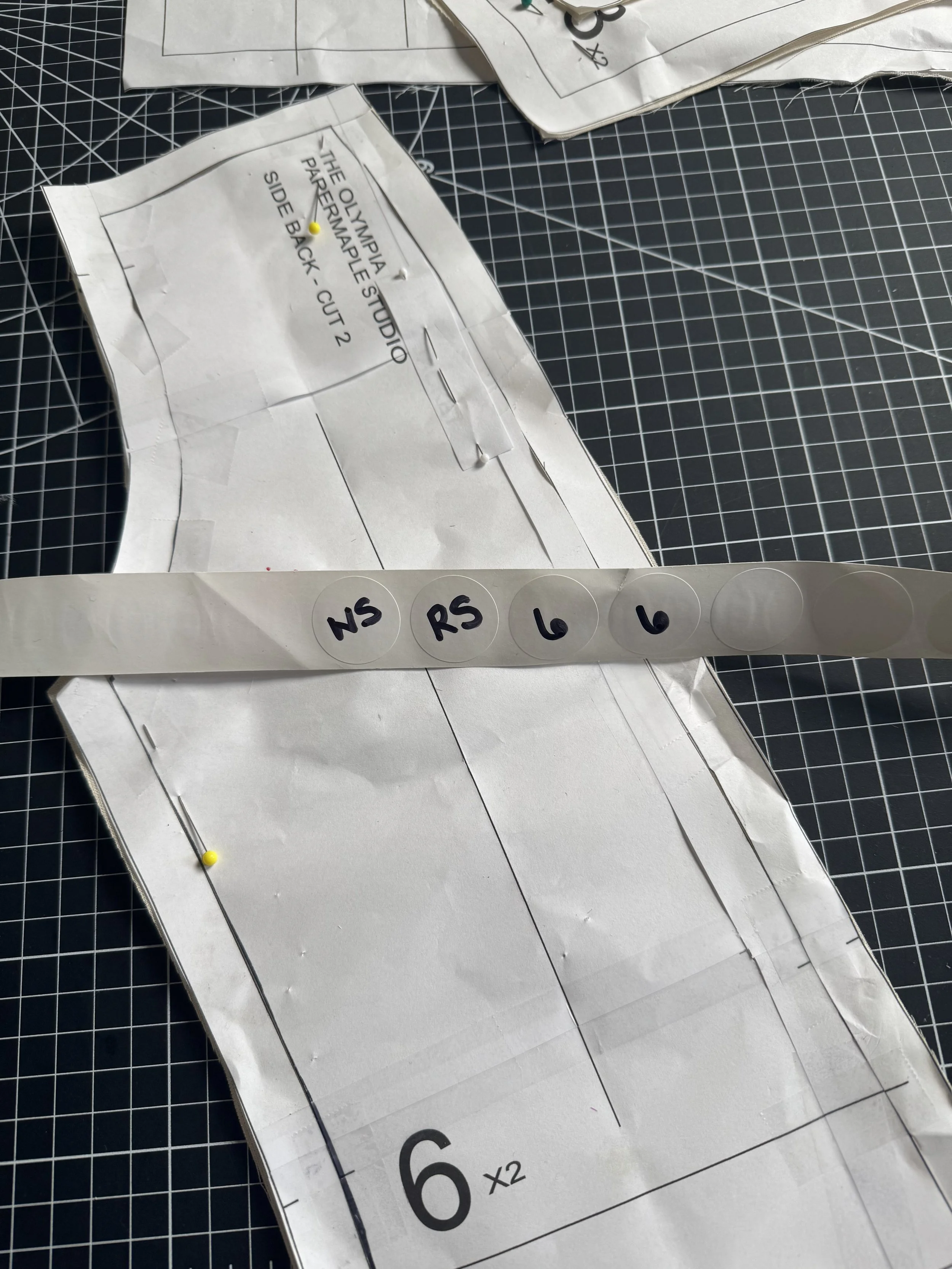 Once I remove pattern pieces, I use sticky dots as notation marks. I have also used them here to mark the right side (RS) and wrong side (WS) of the garment.