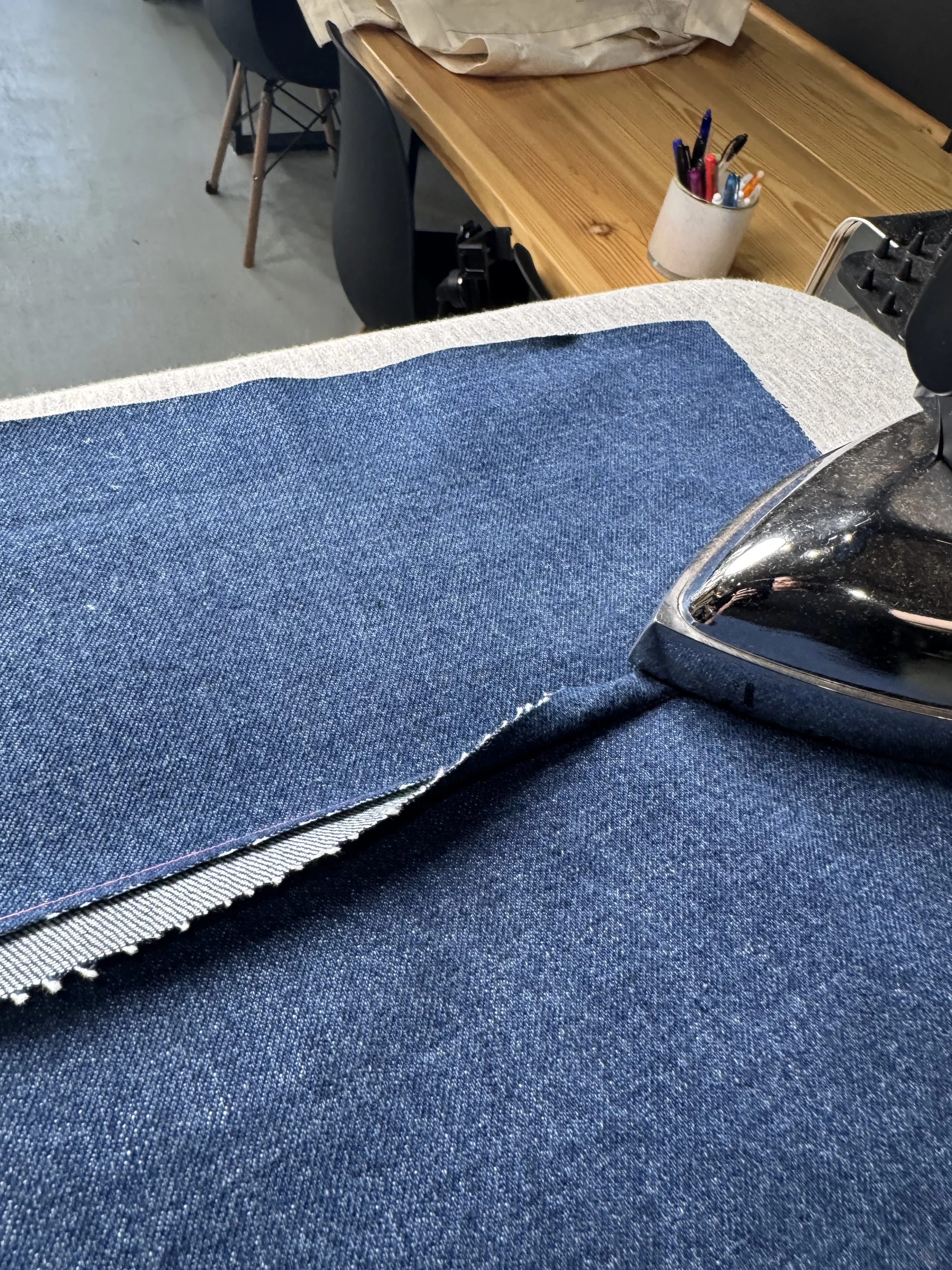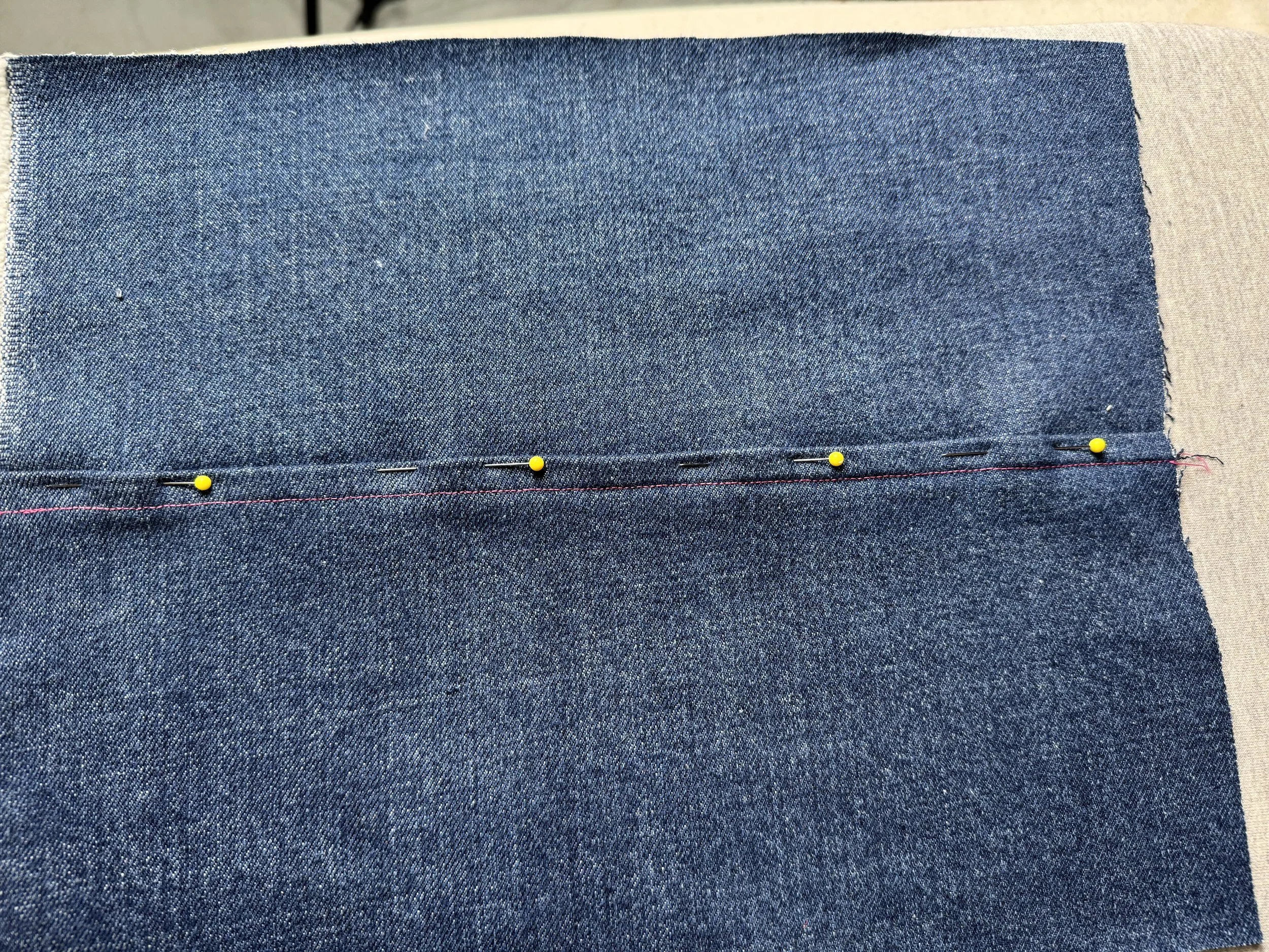 Fold the larger seam over the shorter seam, and press as you go, pinning to hold the fold in place.