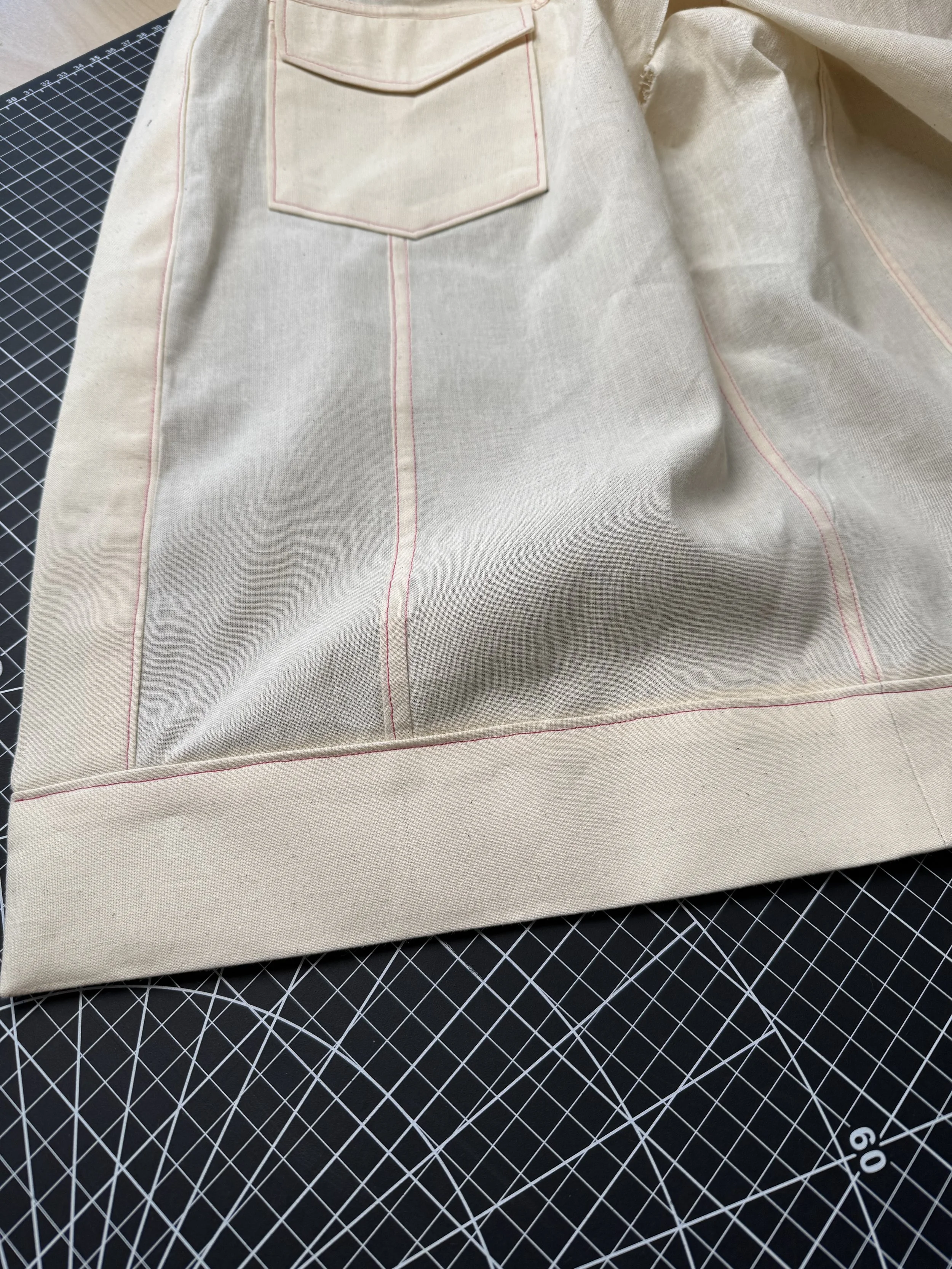 Starting at the bottom edge of your waistband, stitch towards the front and continue up the entire length of the outside of your placket, slowly up to the Collar edge and back down to the other side of the placket until you reach the starting point of the waistband.
