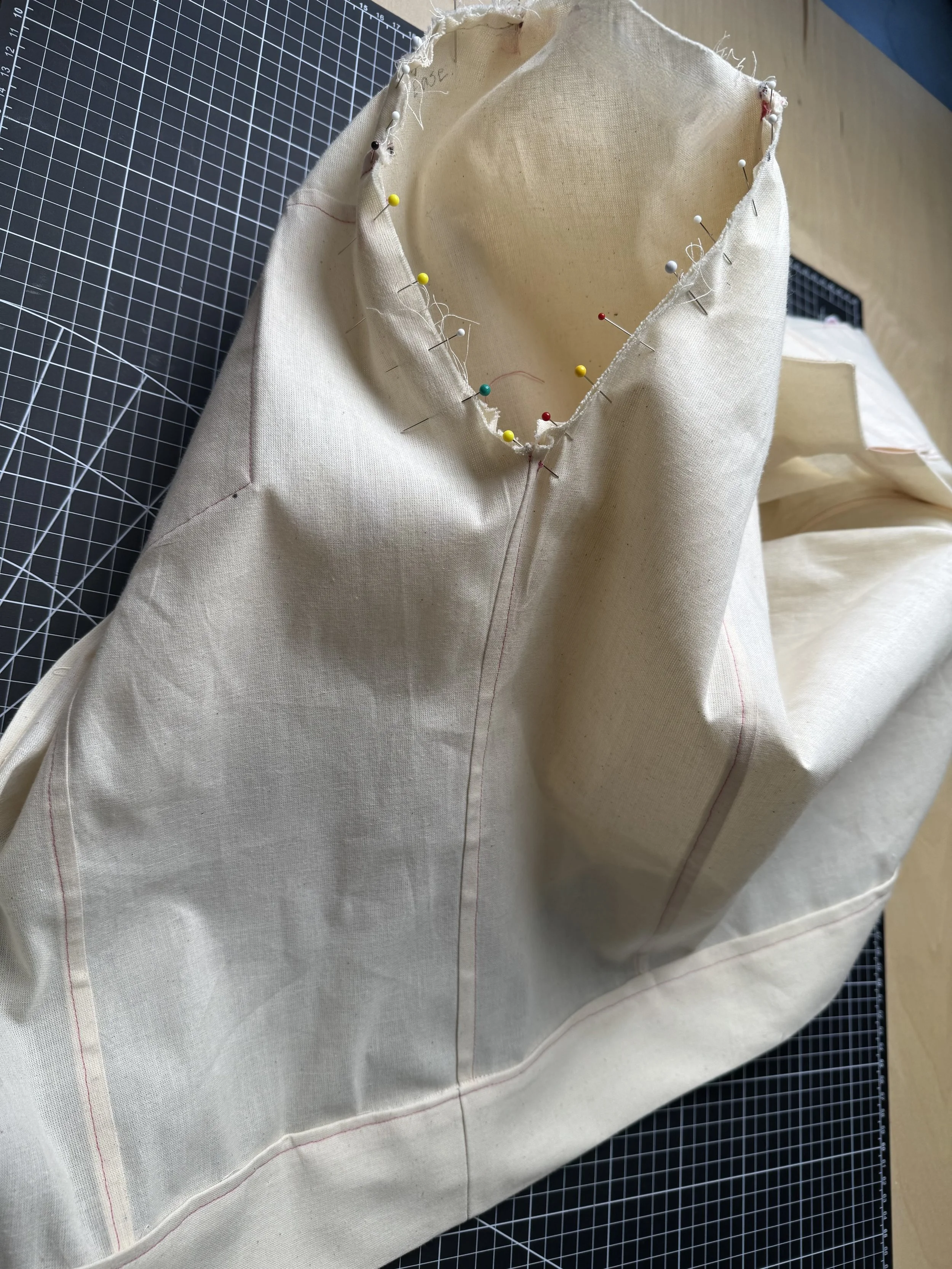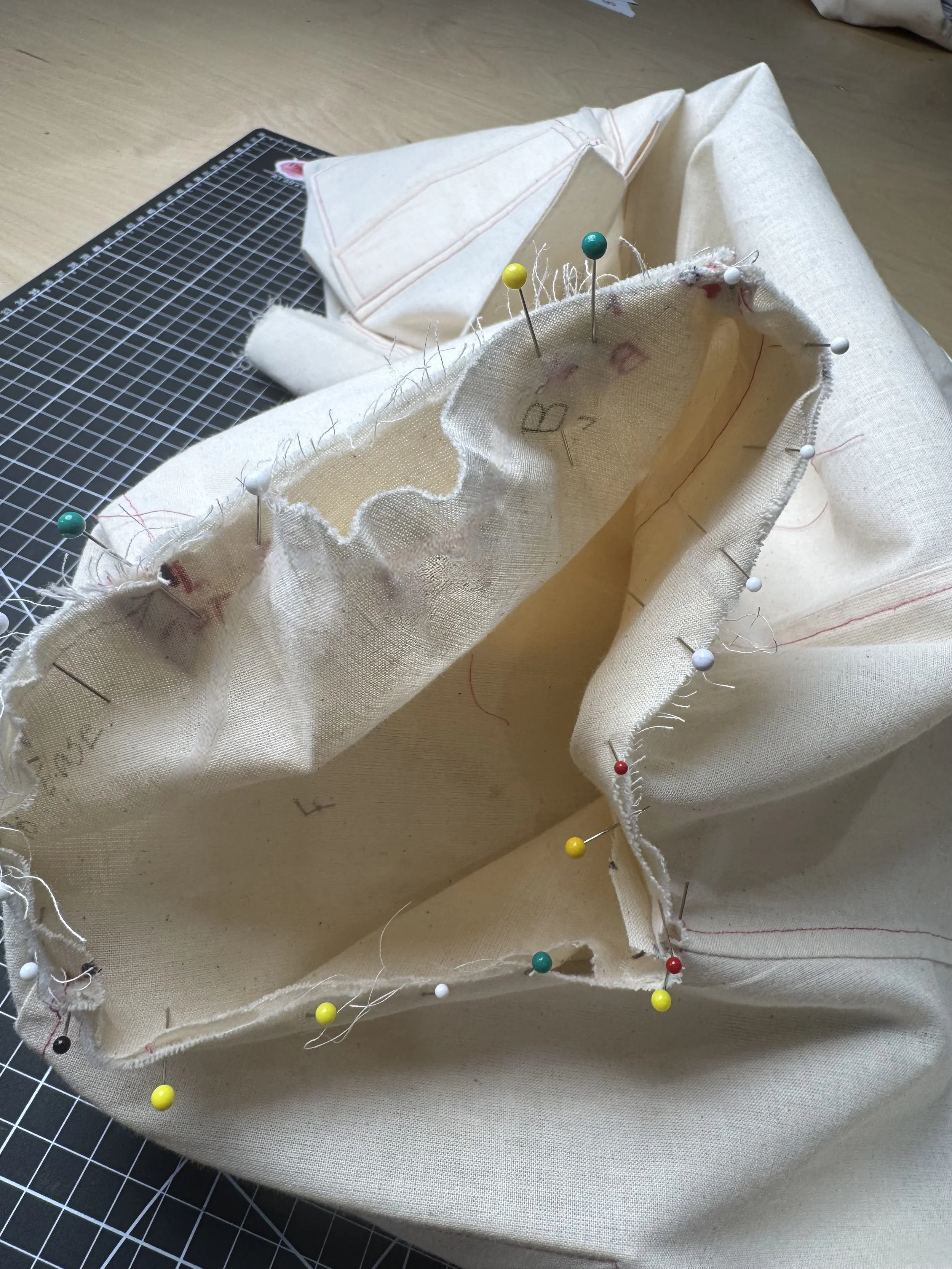 Working slowly from the shoulder to the side seam on the front, start pinning every 1/4” or so, we do this initially to see if any easing will be necessary.